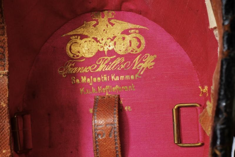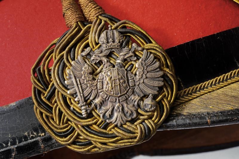 Rigido fusto rivestito in fine panno rosso, con imperiale di forma ovale in cuoio verniciato nero, come pure la visiera e la fascia. Gallone in oro e distintivo di grado per ufficiali subalterni. Fregio con aquila bicipite dorata. Nappina mancante. Presenza dei rari ornamenti di grande uniforme: i cordoni dorati screziati di nero e le "racchette" sulle quali é cucita l'aquila imperiale in ottone. Interno in seta rossa con nome del fornitore di corte "Franz Thill's Neffe", alluda in pelle marrone.