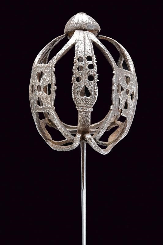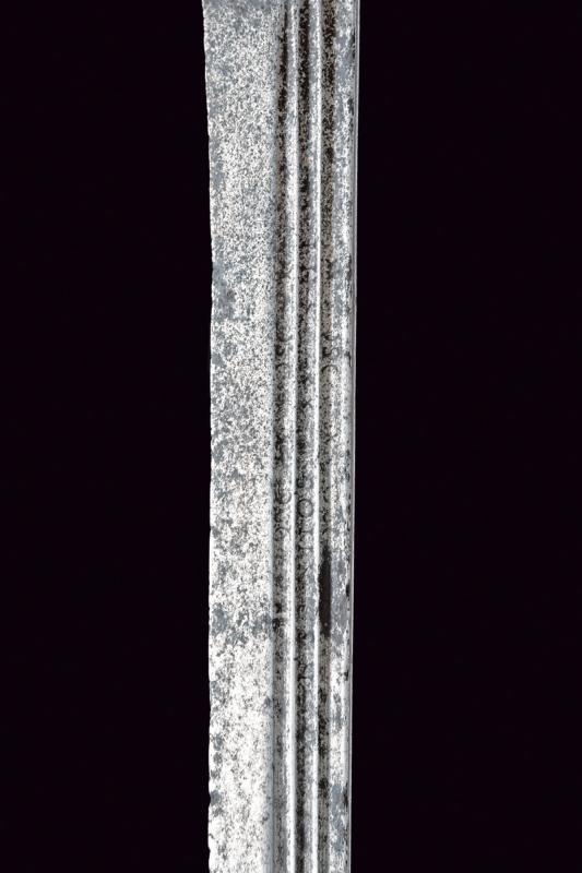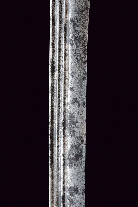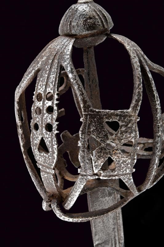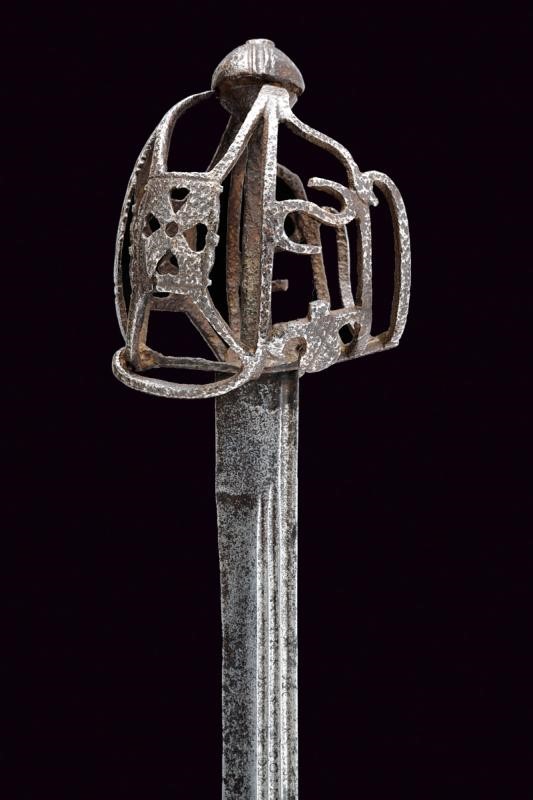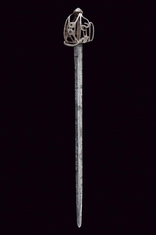 Lama dritta a un filo e controfilo, triplice scanalatura su tutta la lunghezza recante alla base resti di iscrizioni; tallone con marca. Tipico fornimento a gabbia (danni da ruggine) parzialmente traforato a cuore, quadrifoglio e cerchi; tra i rami elementi ad "S" e gigli stilizzati. Pomo a turbante con quattro scanalature. Impugnatura mancante.