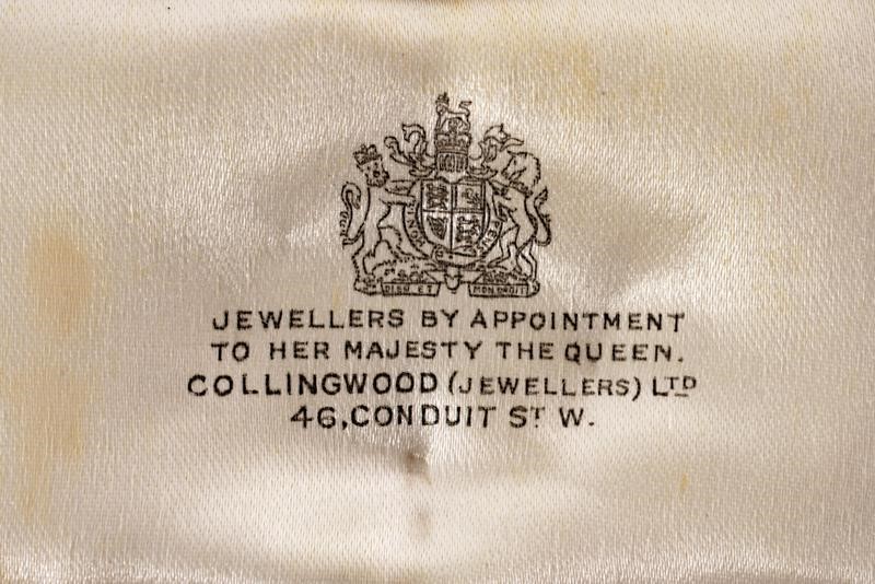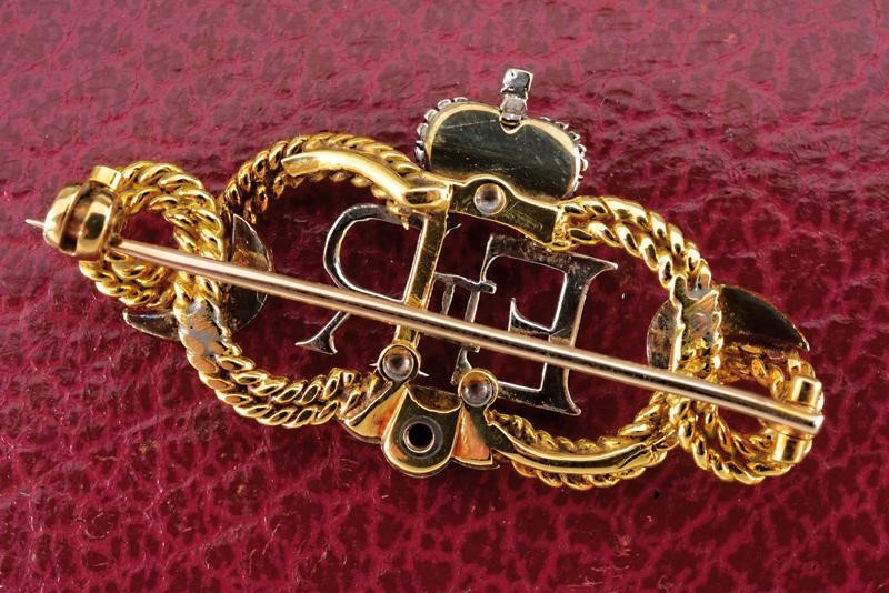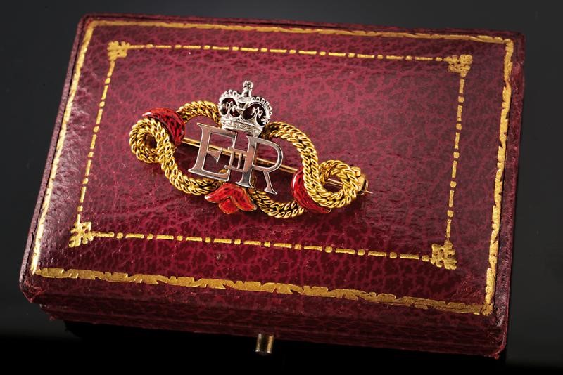 Bellissima spilla in oro giallo e oro bianco parzialmente smaltata, recante al centro il monogramma di Elisabetta II sotto corona, sul retro spilla orizzontale. In scatola con timbro "JEWELLERS BY APPOINTMENT TO HER MAJESTY THE QUEEN. COLLINGWOD (JEWELLERS) L.TD 46, CONDUIT ST. W. 2".