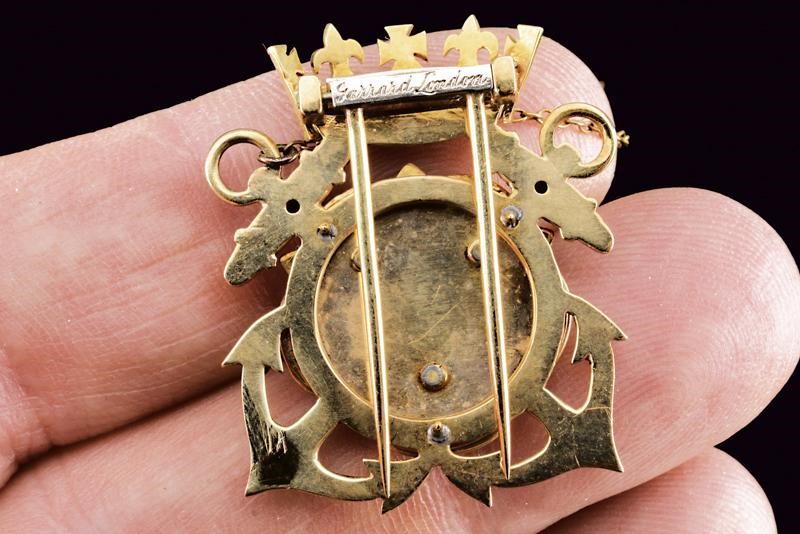 In argento dorato e smaltato, raffigurante un fiore posto su due ancore incrociate e caricato con il monogramma reale, il tutto sormontato da corona. Il retro con doppia spilla pieghevole e tre piccoli aghi per un perfetto fissaggio. Marcata "Garrard London". Con catenina.