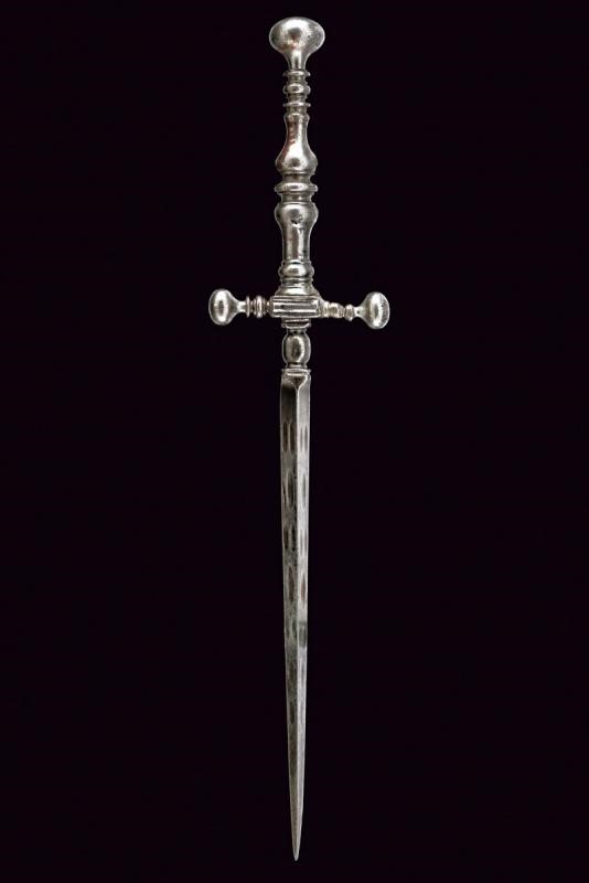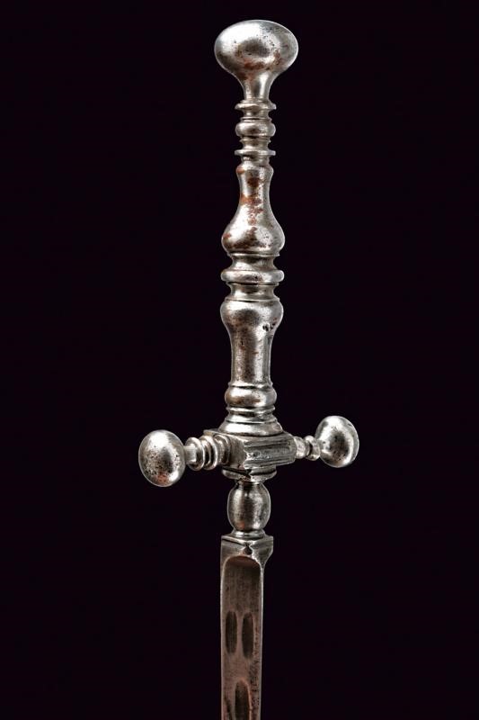 Lama dritta di sezione triangolare, tutte le facce con brevi sgusciature. Fornimento in ferro massiccio, bracci dell'elso dritti con estremità ingrossate, massello rettangolare. Impugnatura a balaustro non simmetrico, pomo a fico rovescio.