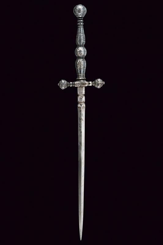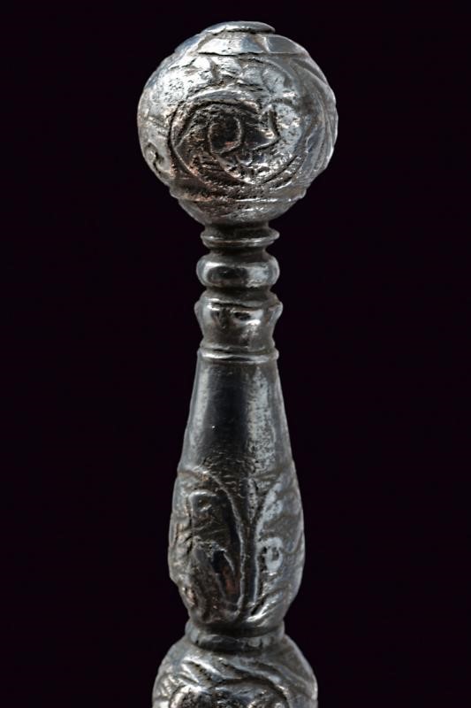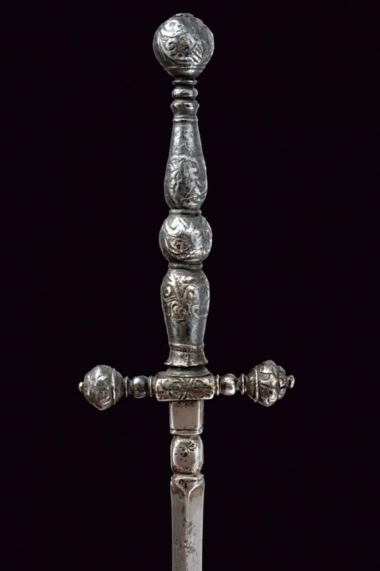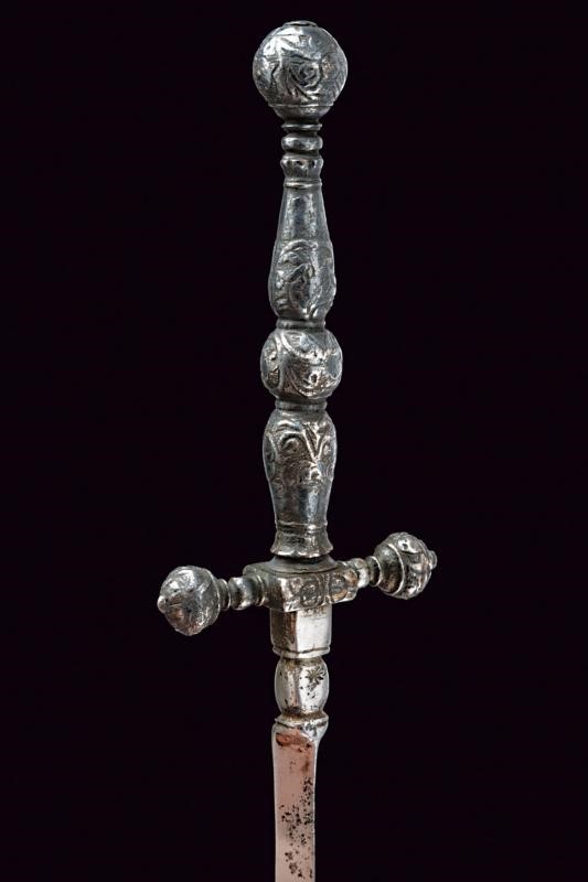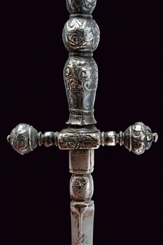 Lama dritta di sezione triangolare con brevissimo tallone. Nodo con punzone. Fornimento in ferro massiccio interamente intagliato a motivi floreali, bracci dell'elso dritti con testa a bocciolo bottonato, impugnatura a doppio balaustro con grosso bottone sferico al centro.