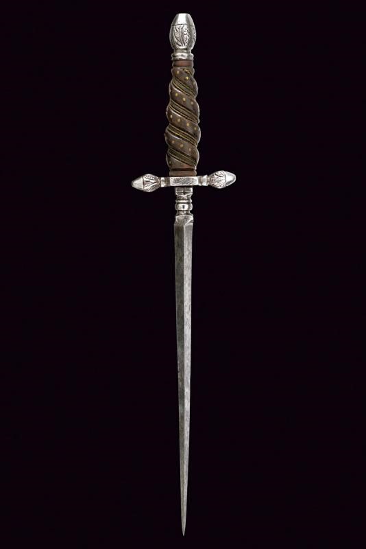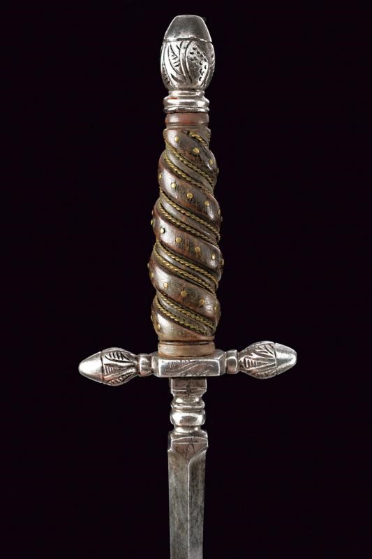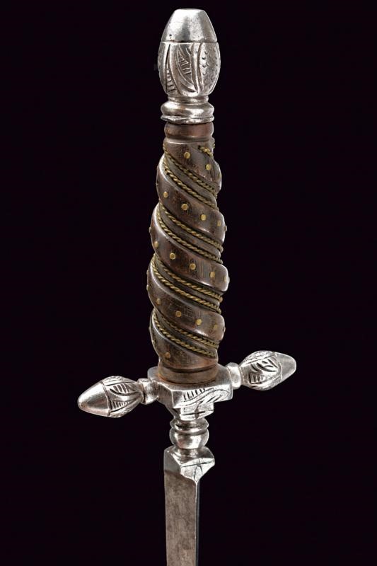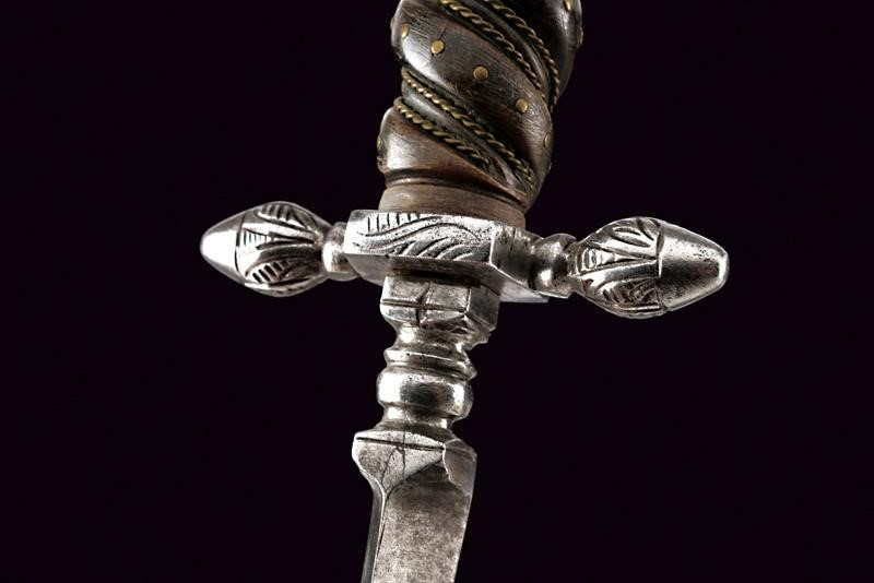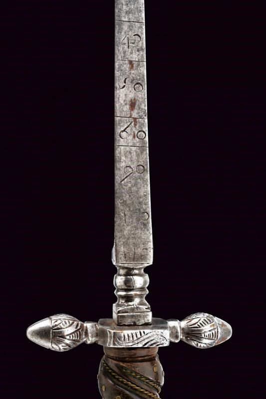 Robusta lama dritta di sezione triangolare, con scala graduata da uno a centoventi sulla faccia più ampia. Fornimento in ferro con bracci dell'elso e pomo incisi a ghiande. Impugnatura (piccole mancanze) in corno scolpito a spire e decorato con trecciola e chiodi in ottone.