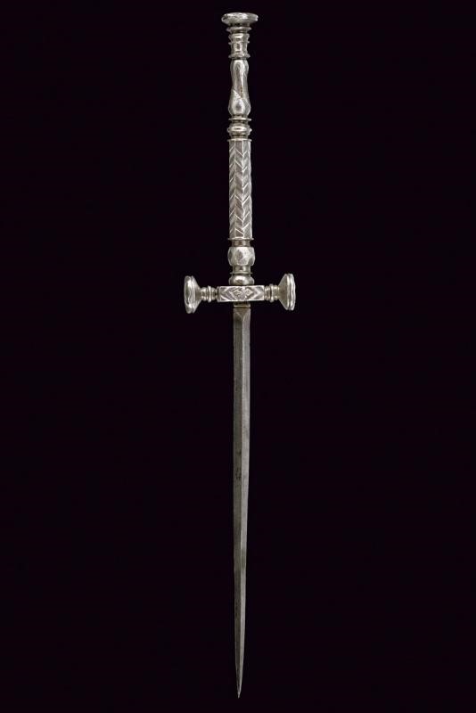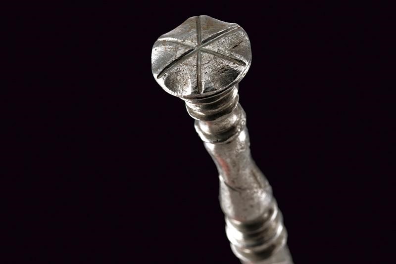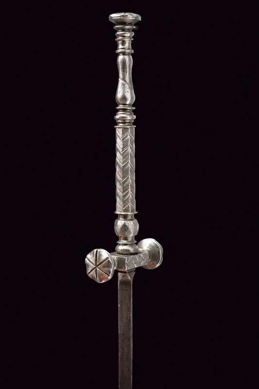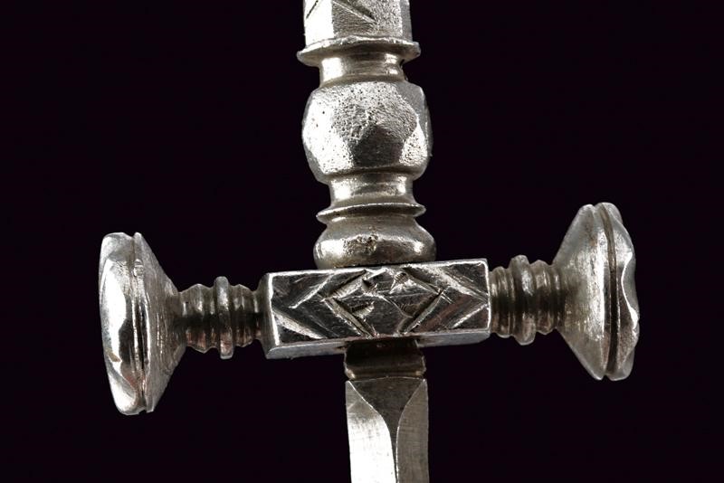 Lama dritta di sezione triangolare. Fornimento in ferro massiccio, brevi bracci dell'elso dritti dotati di testa a disco con dorso inciso a raggi; massello rettangolare lievemente inciso. Impugnatura incisa con bande a zig-zag. Pomo en suite con l'estremità dei bracci dell'elso.