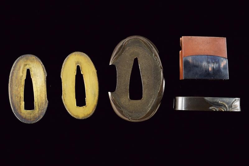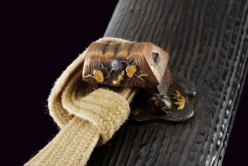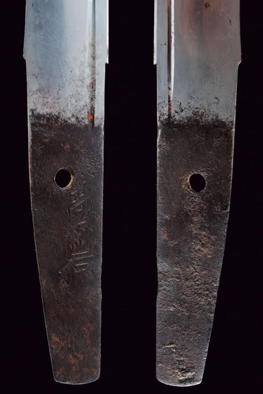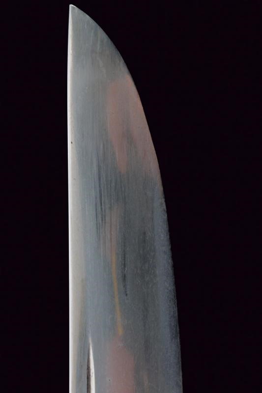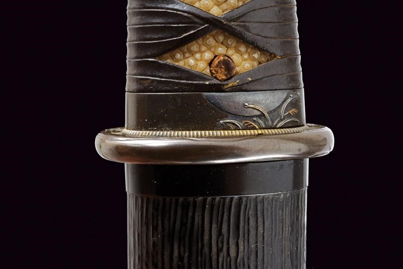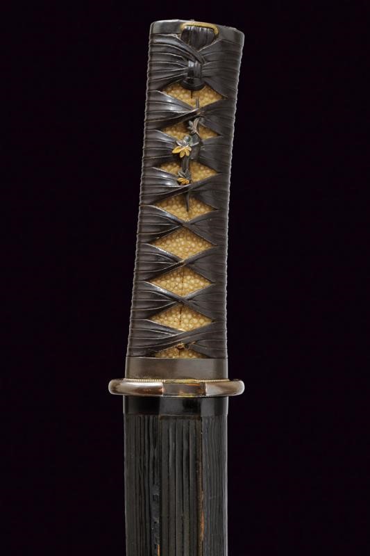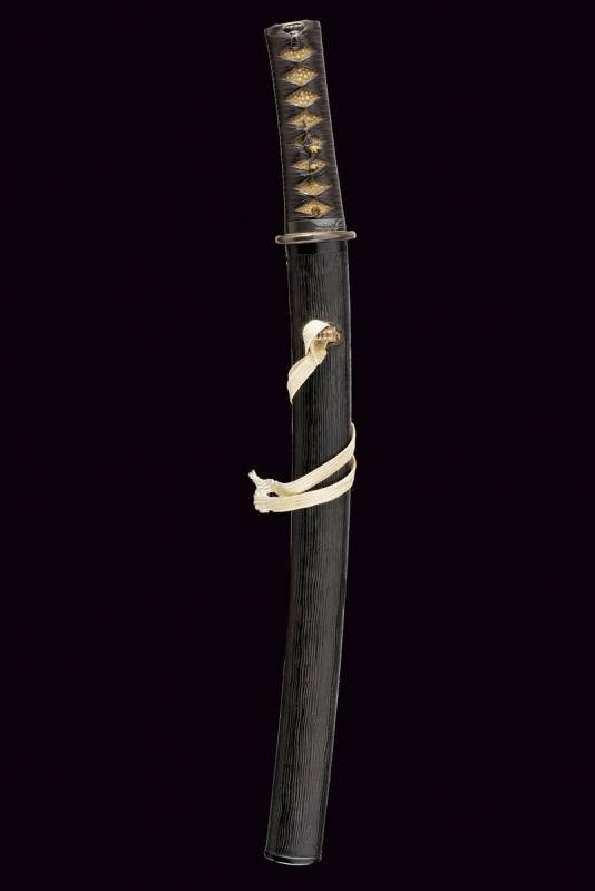 Nagasa 30.2 cm. Hamon: Hoso Suguha; hada: Itame Masame, doppio habaki in rame; Nakago mei "Kanewara", Ubu Kurijiri; Yasuri Higaki. Bellissima koshirae con tsuba ovale in shakudo, fuchi decorato con erba sotto la luna, kashira con volatili, sempre in bassorilievo parzialmente in oro ed argento. Eleganti menuki in shakudo annerito e dorato decorati a motivi floreali. Tsuka in pelle. Saya in legno laccata e decorata a sottili scanalature simili alla struttura di legno, bellissimo Kurigata in rame a lavorato a effigiare un edificio, con decorazioni floreali parzialmente dorate. Tardo Periodo Muromachi - inizio Tensho (circa 1573), scuola Minoseki, gruppo Shizo Saburo. Kanewara lavorava come Wakasa No Jo Ujifusa.