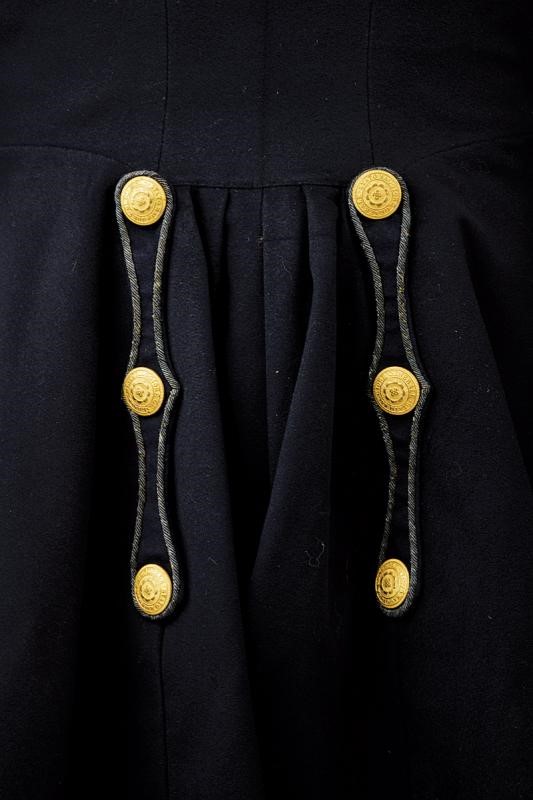 Il cappello in tessuto turchino scuro con visiera (parzialmente staccata) e soggolo in pelle, il fregio "CA" sotto corona staccato, bottoni dorati con fiore e marcatura "Stato Maggiore Generale". La giacca in panno turchino scuro con colletto e polsini decorati in canutiglia dorata, completa di spalline e bottoni dorati in due file, marcati "Stato Maggiore Generale".