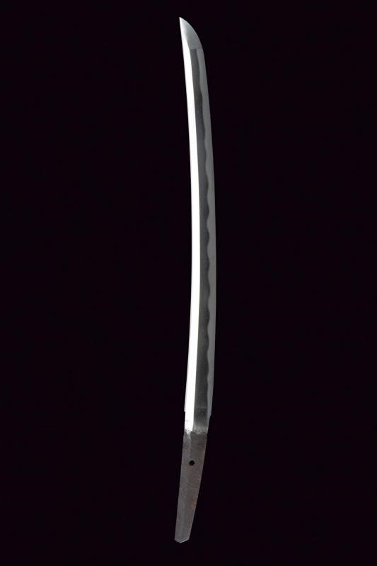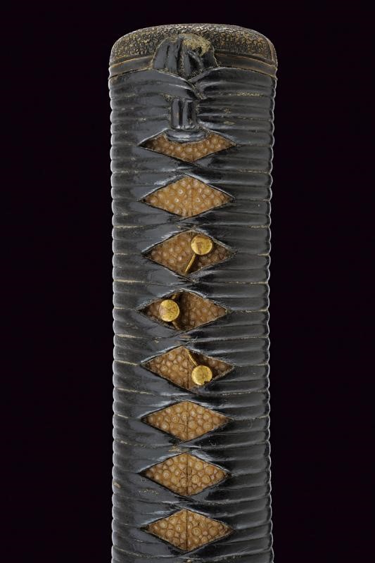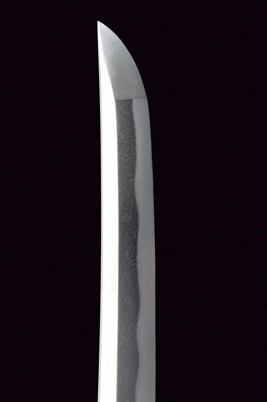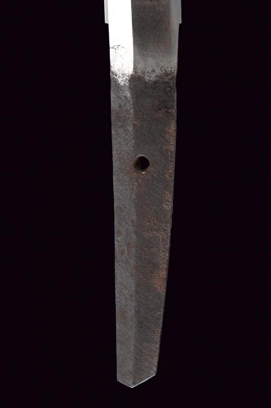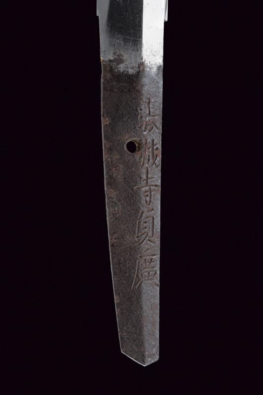 Lama Shinogi-zukuri, Iori-mune. Nagasa: 39,2 cm. Hamon e Hada visibili. Nakago mei: Hojoji Sadahiro. In koshirae con habaki laminato in argento. Tsuba maru-gata in ferro decorata a traforo con fiore di ciliegio. Fuchi e Kashira lavorati en suite con canne di bambù argentate su fondo a granuli. Tsuka-ito in pelle (laccata), Same in pelle di razza. Menuki effigianti rispettivamente la falce lunare in argento e tre punti collegati da linee (una costellazione?). Saya di produzione più recente con rivestimento in lacca nera screziata verde-oro. Lama epoca Shinto. Koshirae Tardo Edo.