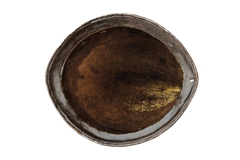 Coppo in un solo pezzo, costolato in mezzeria e con apice girato all'indietro, recante alla base un giro di rivetti con rosette in ottone (mancanze); breve tesa leggermente spiovente con margine ribassato e bordo cordonato liscio, la parte posteriore con marca coronata. Manca la pennacchiera.