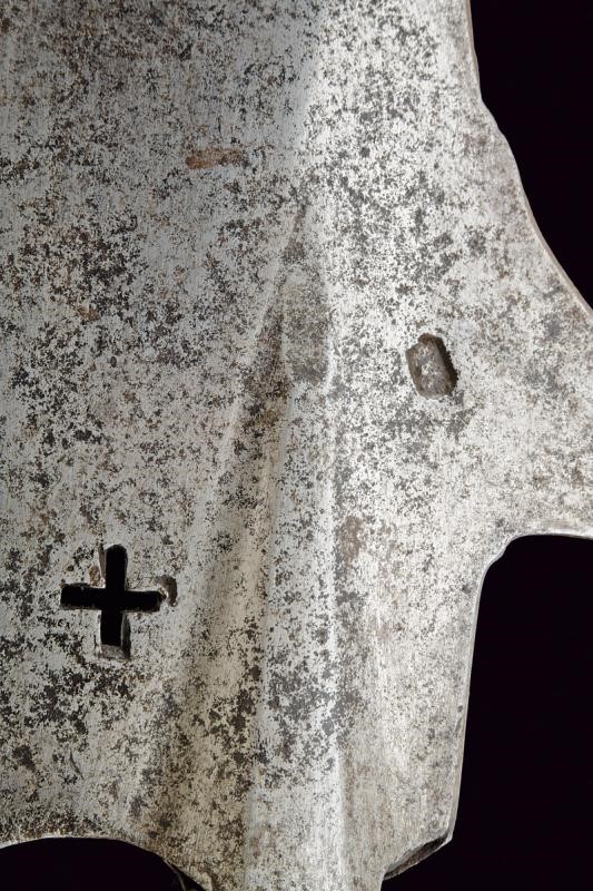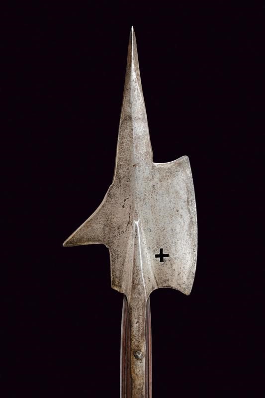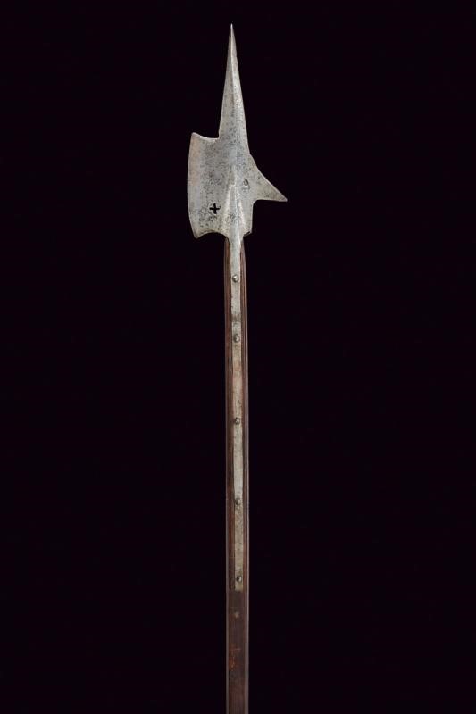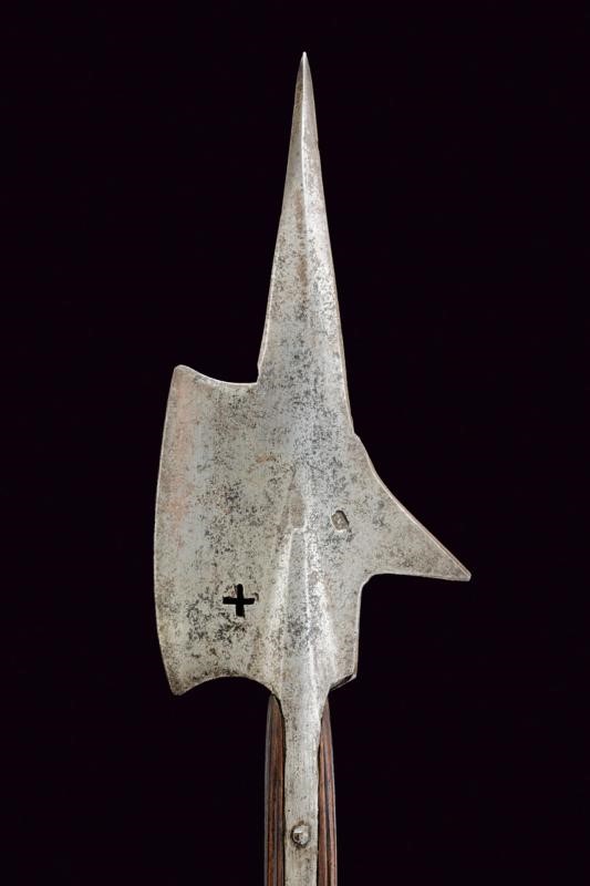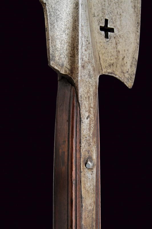 Ferro con robusta e breve cuspide sommitale, a sezione di losanga nella prima metà, poi ingrossata sino a diventare un quadrello. La scure a taglio convesso poco accentuato e con collo solo lievemente rastremato, recante una sforatura a croce elvetica. Il becco dritto e leggermente appuntato verso il basso. Su una faccia presente un punzone profondamente timbrato ma non leggibile. Le bandelle molto lunghe, una con vecchia riparazione. Il fusto in legno probabilmente più tardo.