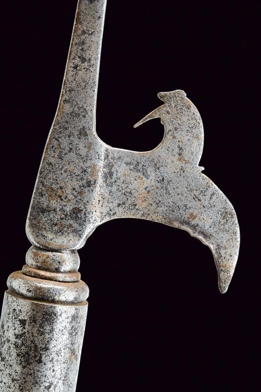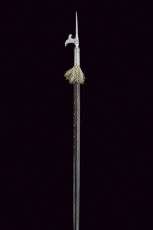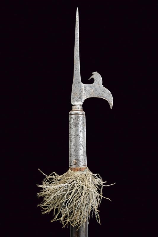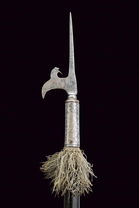 Cuspide in ferro di sezione rettangolare, un singolo arresto laterale con becco rivolto verso il basso e dotato di una gobba sagomata a testa di gallo. Nodo sferoide. Spessa gorbia troncoconica priva di bandelle. Su asta lignea più tarda, di sezione ottagonale, parzialmente ornata con borchiette e munita di nappina in tessuto argentato.