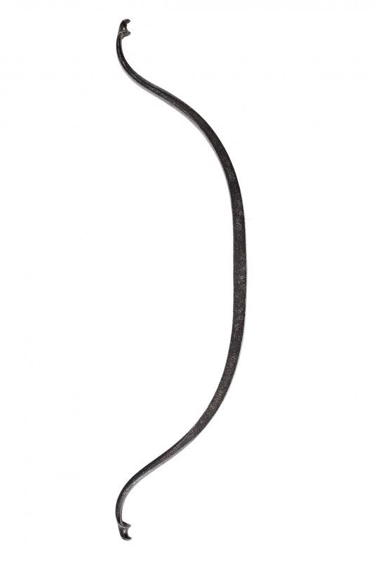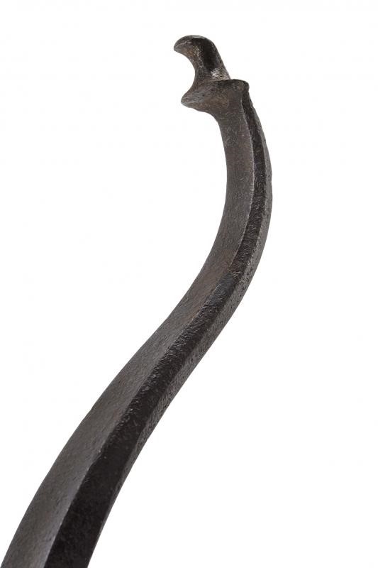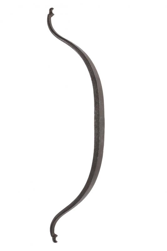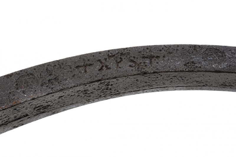 In ferro di sezione rettangole, controcurvato alle estremità e con fermo per la corda. Al centro vari punzoni "A", iscrizioni "IHS", "XPS" e altre illeggibili.