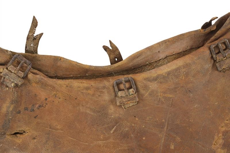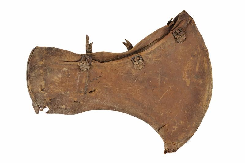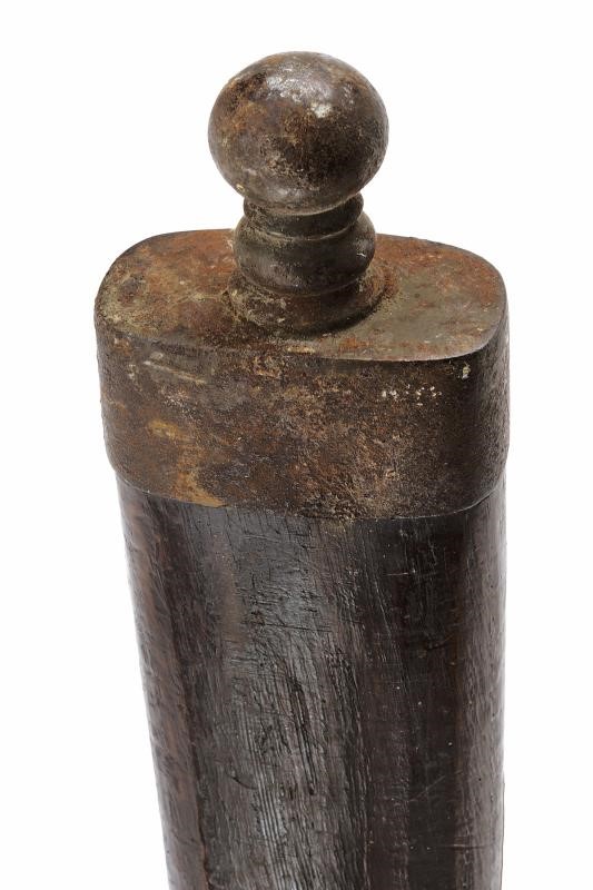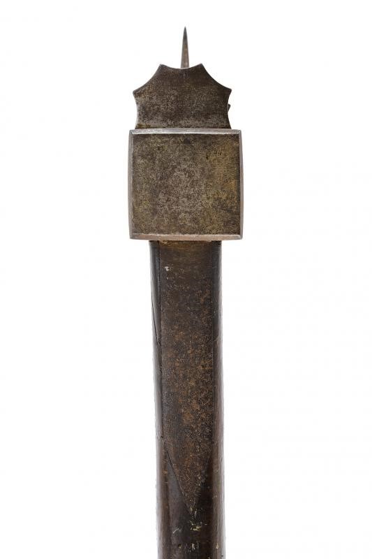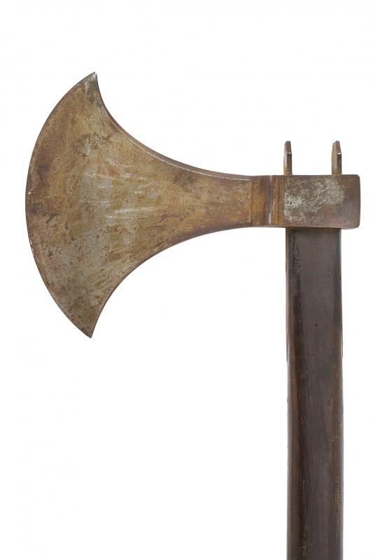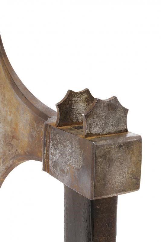 Pesante scure in ferro con taglio convesso, massello rettangolare, alla sommità due elementi in ferro intagliati a stella con lati curvi. Possente fusto ligneo, la base con bottone in ferro. Insieme alla rarissima custodia (segni d'uso e del tempo) in cuoio con fibbie in ferro.