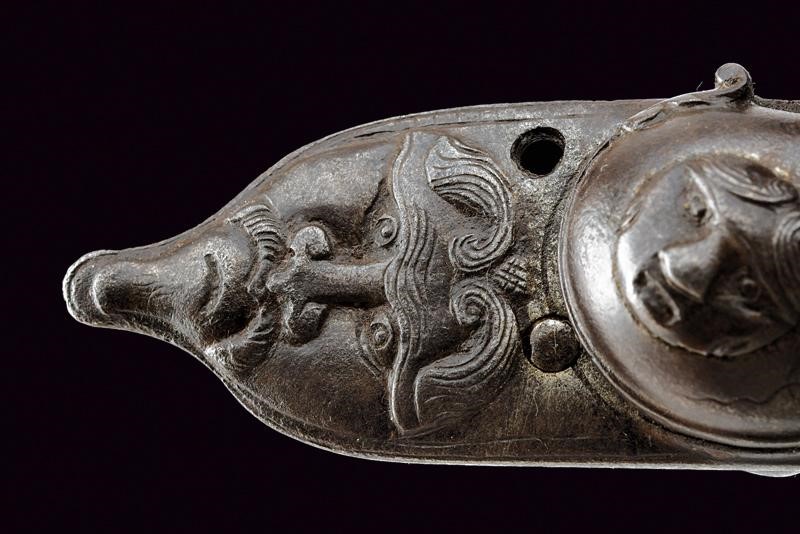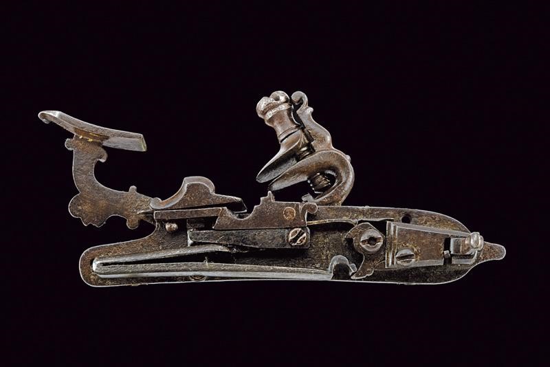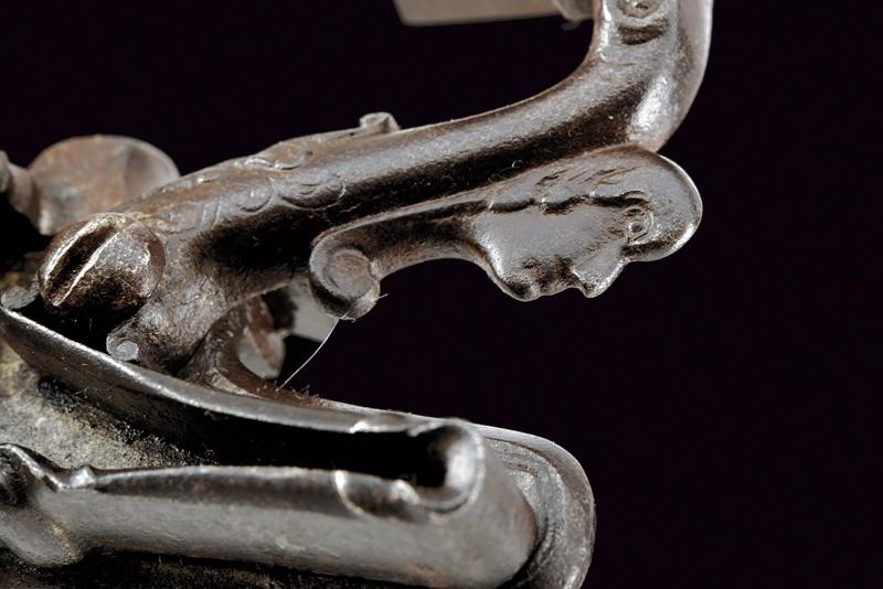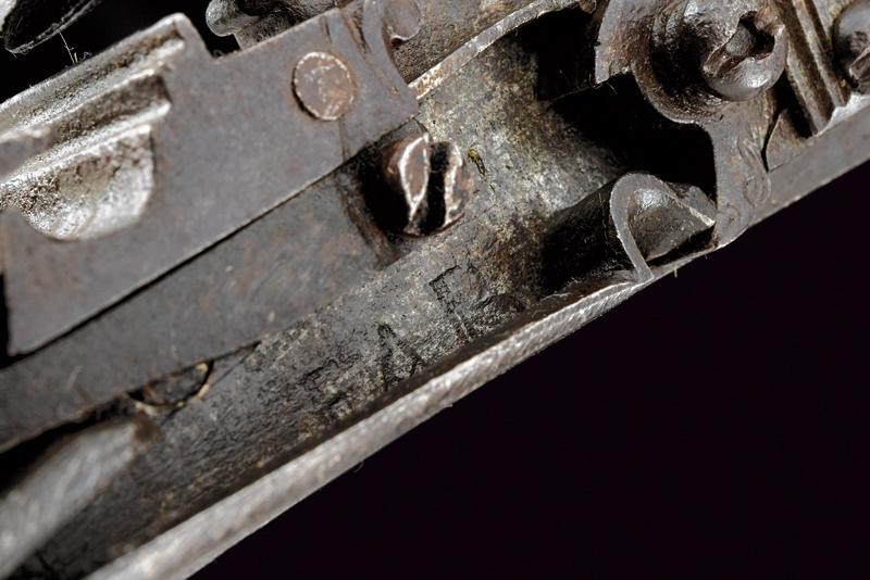Cartella incisa a motivi floreali, codetta intagliata a mascherone in bassorilievo, il cane decorato en suite. Il collo della martellina decorato con un volto. Copriscodellino scorrevole. All'interno monogramma dell'armaiolo "F.A.B.". In bella patina scura.