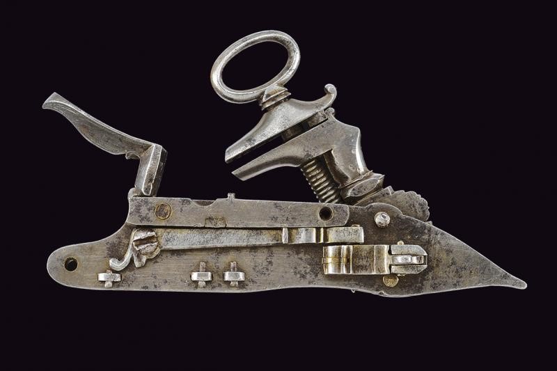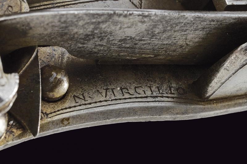Cartella piatta a bordi scantonati, recante alcune delineature, scanalature, cornicette, una piccola incisione floreale in codetta e la firma "N. VIRGILIO". La briglia con un bel mascherone inciso, un simile mascherone alla base dello scodellino, gli altri elementi con piccole incisioni floreali. La meccanica completa.