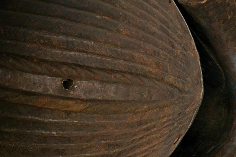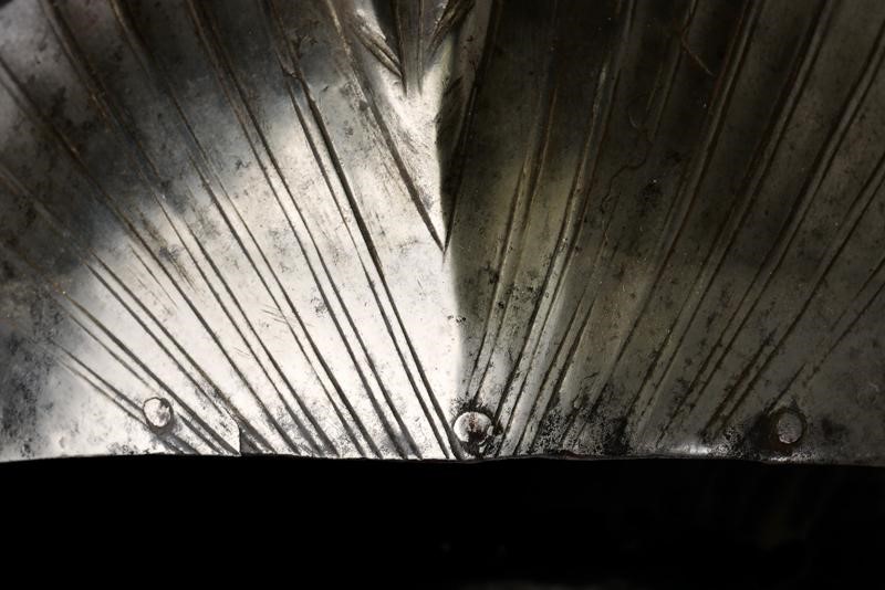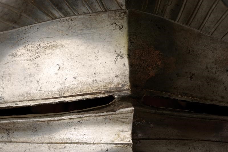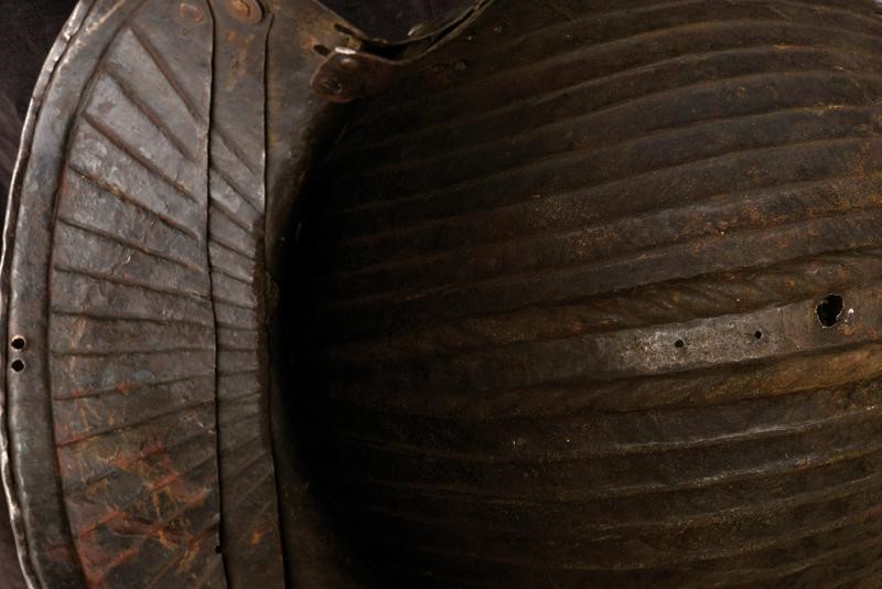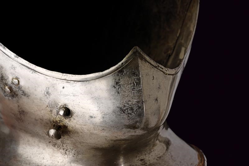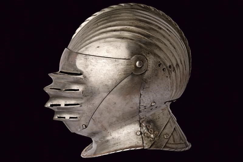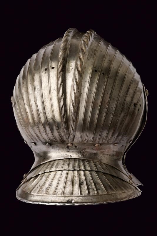 Coppo in ferro realizzato in un solo pezzo e munito di doppia cresta lavorata a fingere il tortiglione, ai lati i tipici cannellini longitudinali. Visiera sana con fessure oculari e fori aeratori sottili e rettangolari, fortemente pronunciata in mezzeria e decorata a singole linee trasversali en suite con il coppo, perno con bottone per l'apertura; barbozza e guardacollo lavorati in un solo pezzo, con margine orlato e lavorato a fingere il tortiglione; gronda a due lame con scanalature centrali e bordo ribassato e lavorato a fingere il tortiglione. Vari piccoli restauri e mancanze.