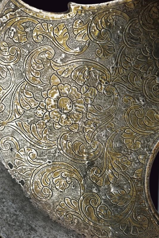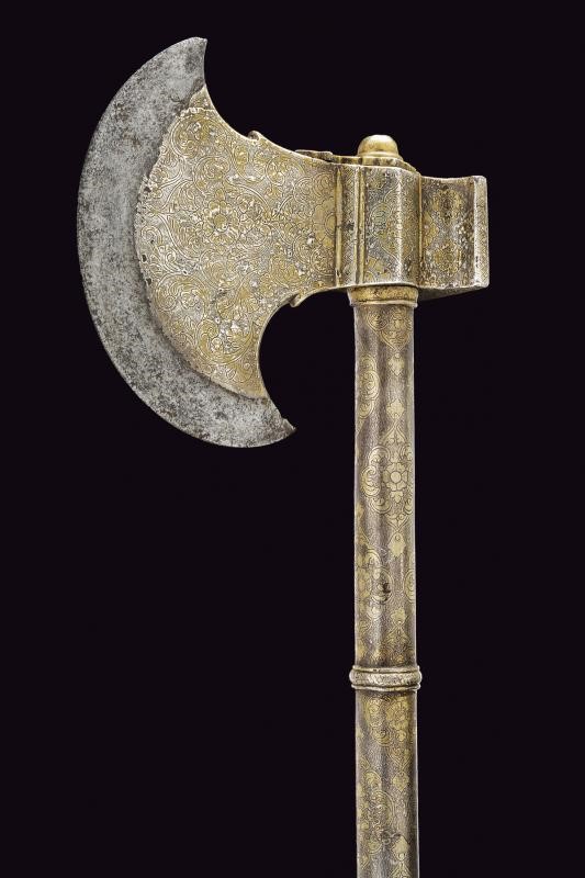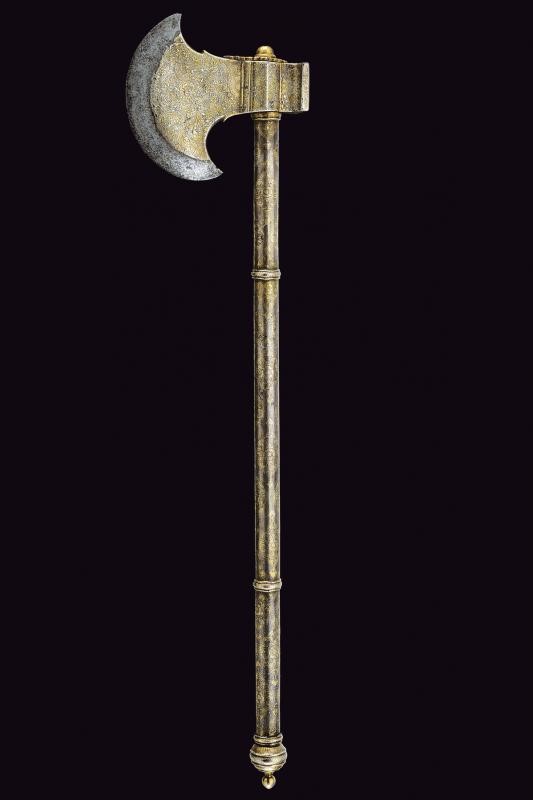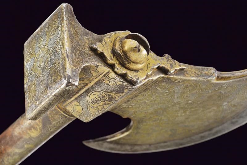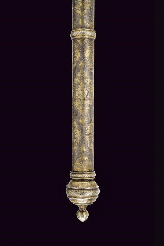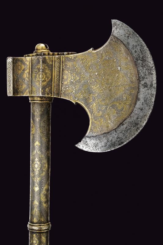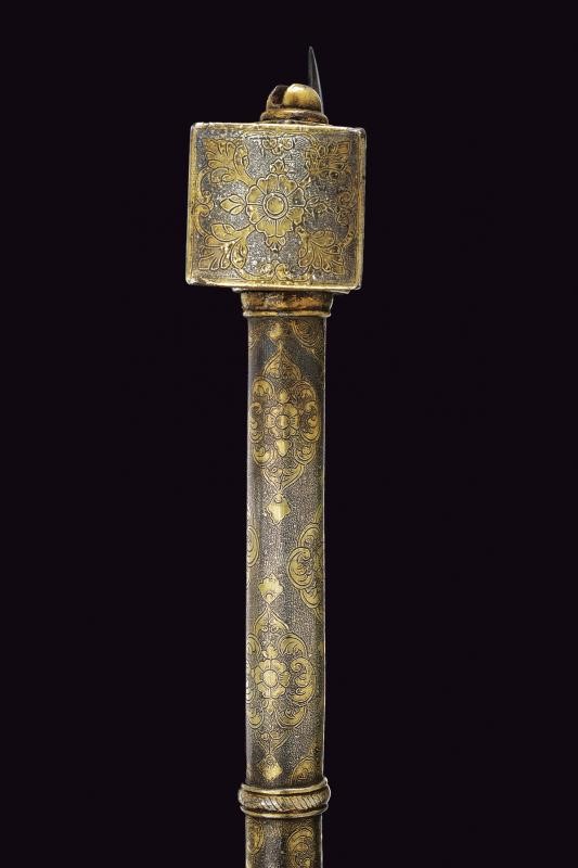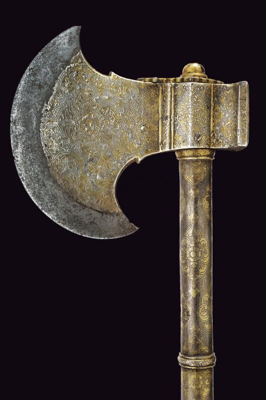 Scure in ferro con taglio convesso, la base rivestita con lamina d'argento incisa a motivi floreali. Il martello, il massello ed il fusto decorati en suite. Il fusto cilindrico suddiviso da due anellature e pomo svitabile con lama a due fili di sezione esagonale.