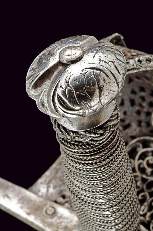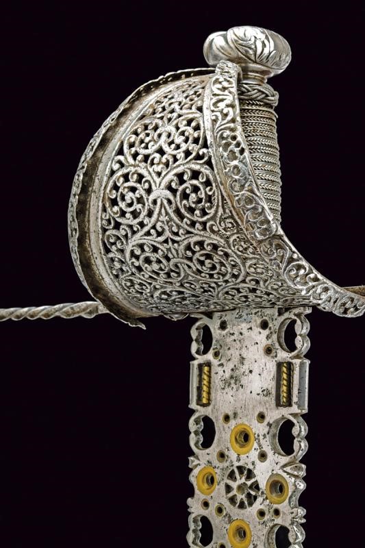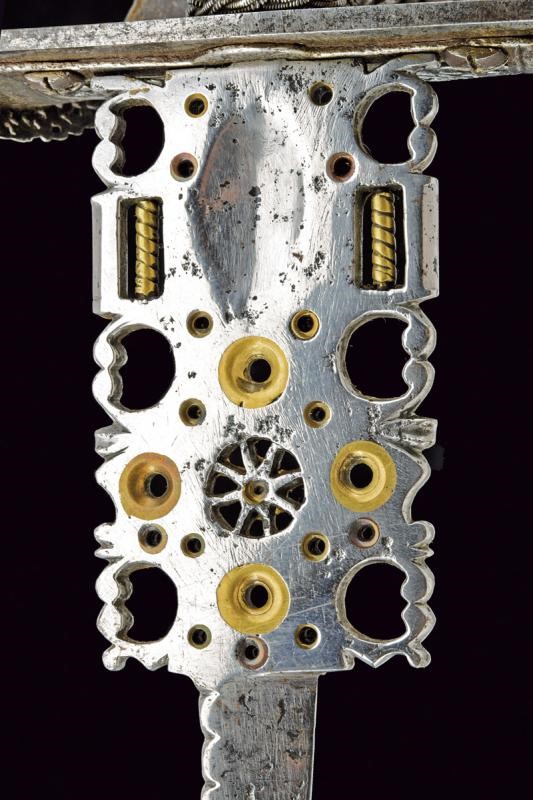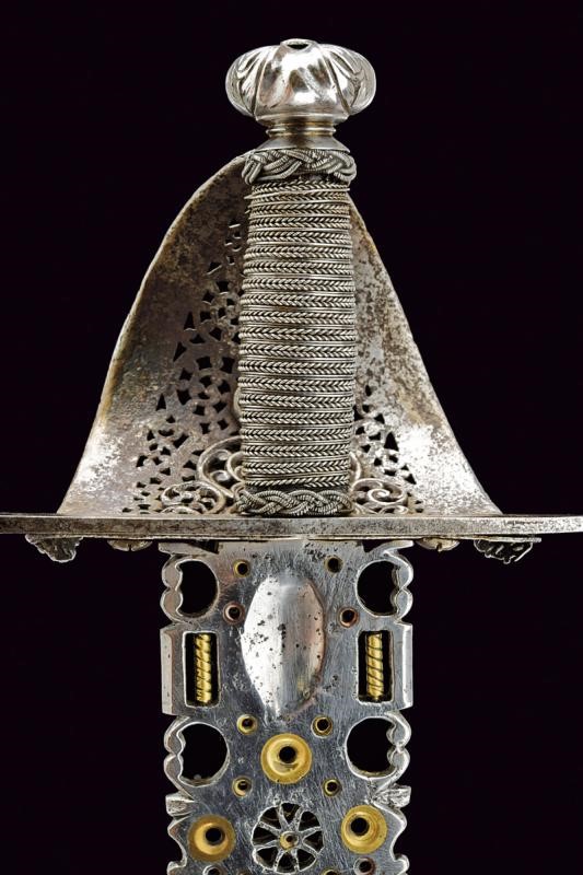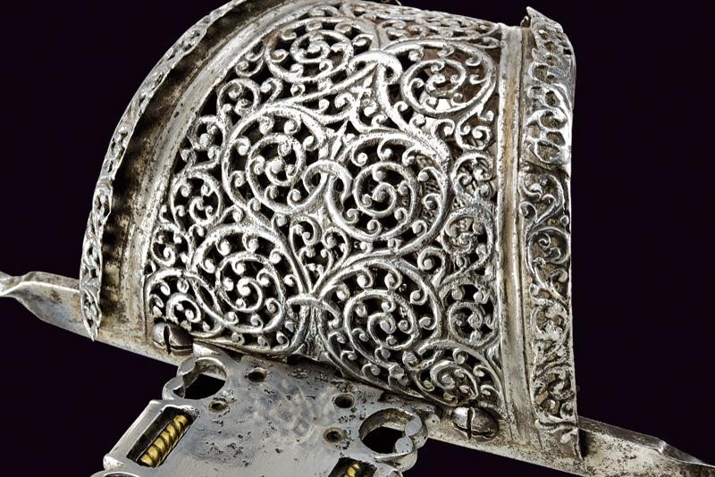 Sottile lama dritta a un filo e controfilo con dorso intagliato e punta di sezione a losanga; ampio tallone traforato e decorato con elementi in ottone. Fornimento in ferro con grande vela riccamente traforata ed intagliata a motivi floreali, dotata di bordo rilevato e ripiegato verso l'interno, decorato en suite. Elso a bracci lunghi, decorati a spire, con bottoni in testa. Pomo a disco finemente intagliato a motivi floreali. Impugnatura in legno rivestita con trecciola e dotata di teste di moro in filo di ferro, di epoca successiva.