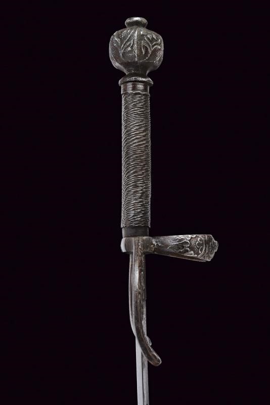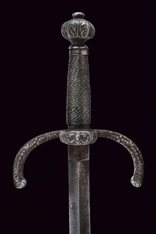 Lama dritta a due fili di sezione a losanga, con aree intaccate, tallone delineato sul bordi e con bel punzone a croce con estremità intagliate a "V". Fornimento in ferro; i bracci dell'elso con base piatta, convessi nella parte anteriore e finemente intagliati a motivi floreali, incurvati verso la lama e pronunciati verso l'alto alle estremità. L'anello di parata decorato en suite con un piccolo mascherone al centro. Pomo faccettato ed intagliato a fiorame. Impugnatura in legno con rocchetto in filo di ferro.