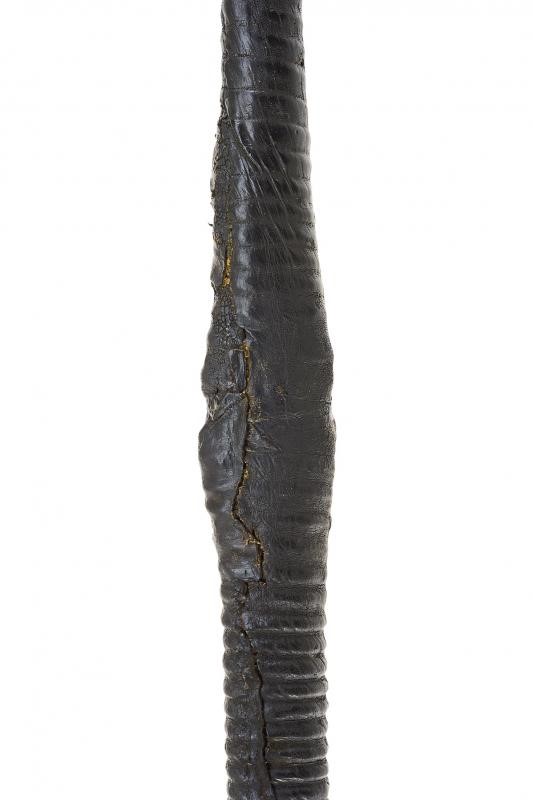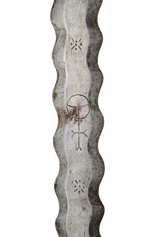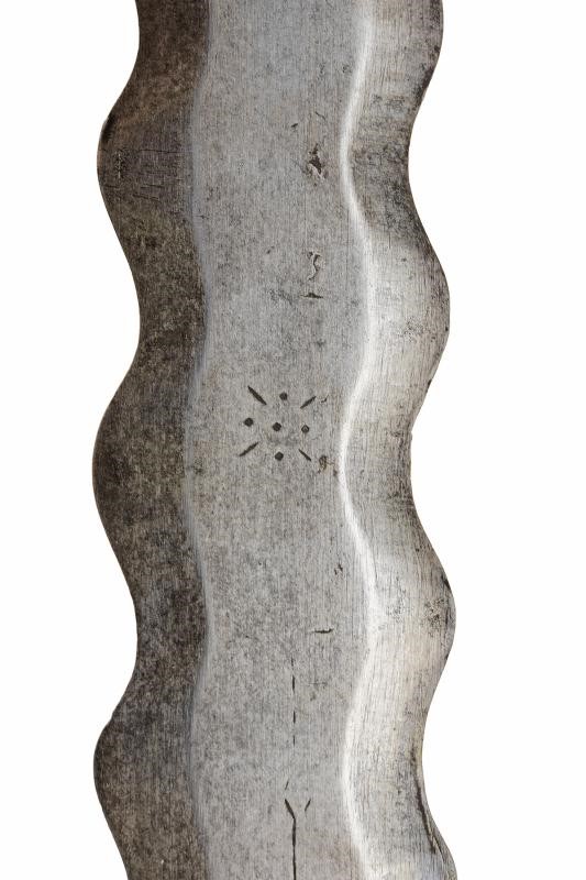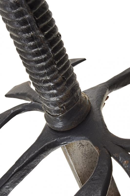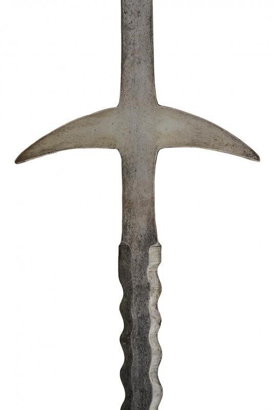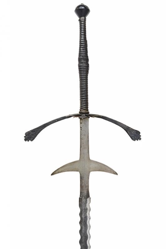 Lama dritta a due fili, incisa su un lato con croce su sfera fra decorazioni. Largo tallone (qualche sforatura alla base) suddiviso in due parti dalle due grandi ali, munite di cuspide rivolta verso la lama. Fornimento in ferro con grandi gigli da parata, ampi bracci dell'elso di sezione rettangolare con estremità piatta, ingrossata ed incisa a motivi floreali. Grande pomo inciso nella parte superiore. Lunga impugnatura in legno rivestita di cuoio nero, crescente verso il centro.