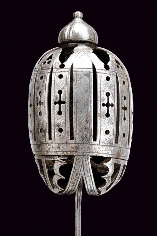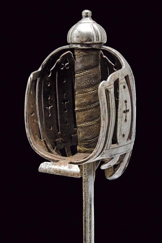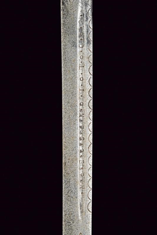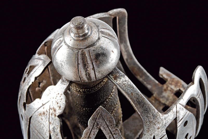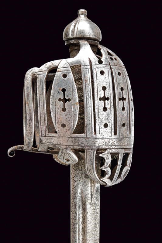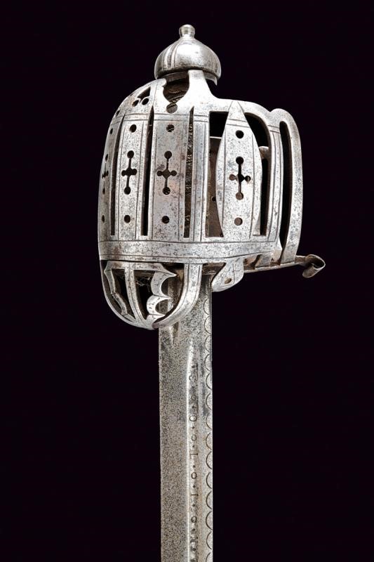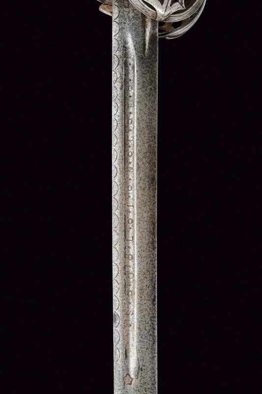 Lama dritta a un filo e controfilo, munita al forte di scanalatura recante lettere e con decorazioni a onde lungo il dorso, alla fine della scanalatura un punzone a fiore su entrambi i lati. Fornimento in ferro con bel cesto, munito di ponticello, parzialmente traforato e delineato; grande pomo scanalato; impugnatura in legno rivestita con pelle di pesce e trecciola metallica.
