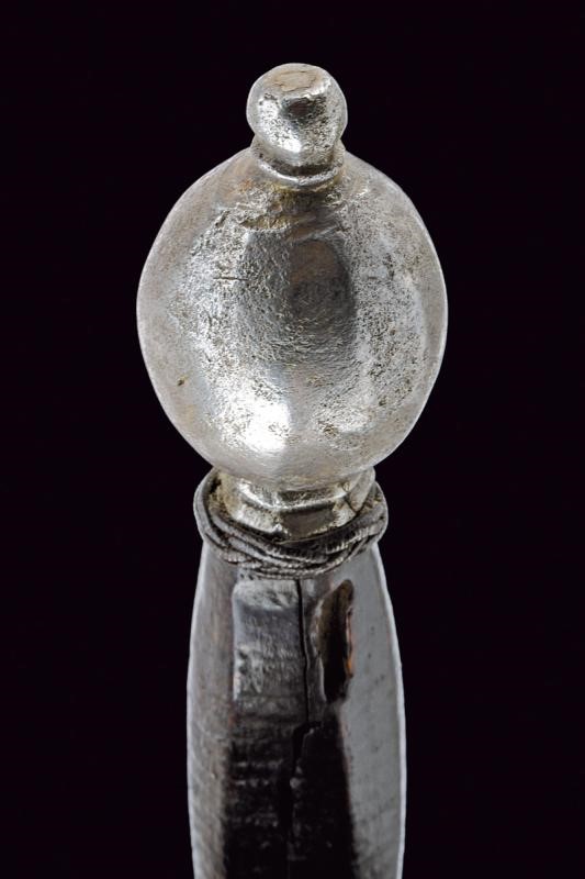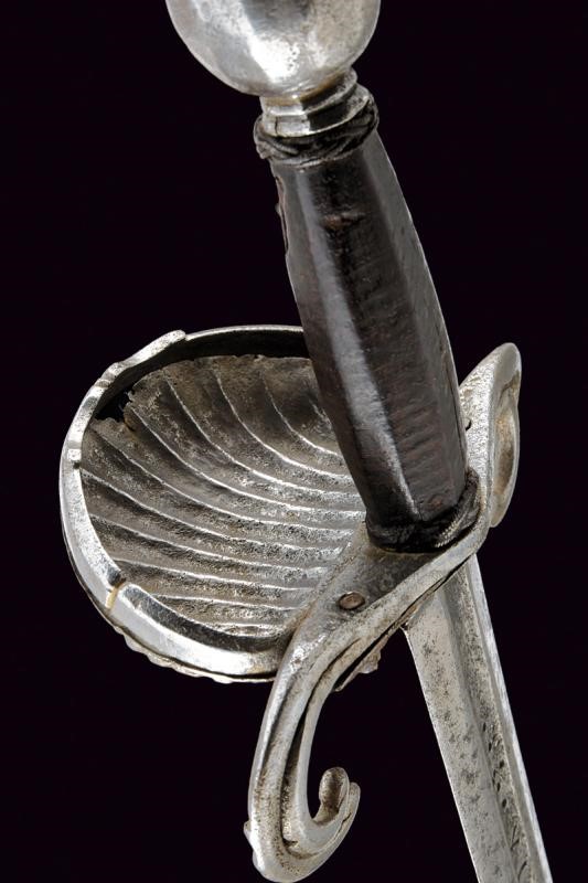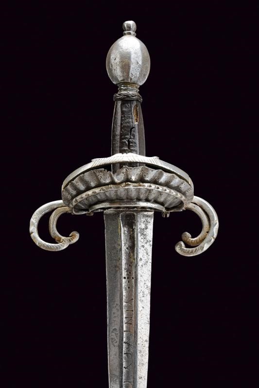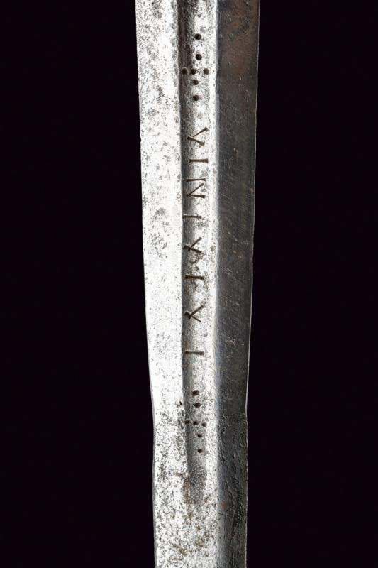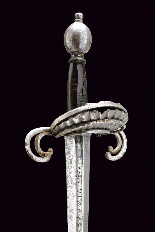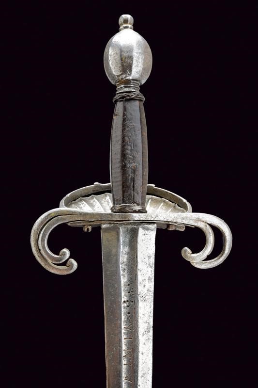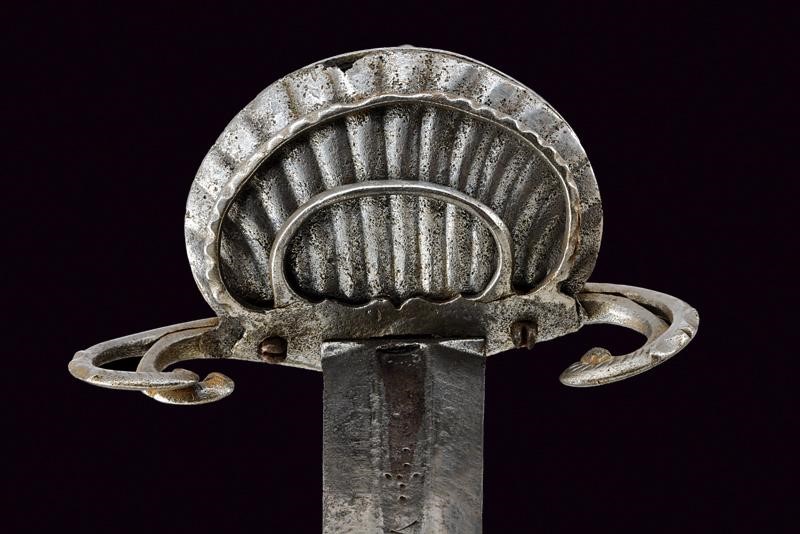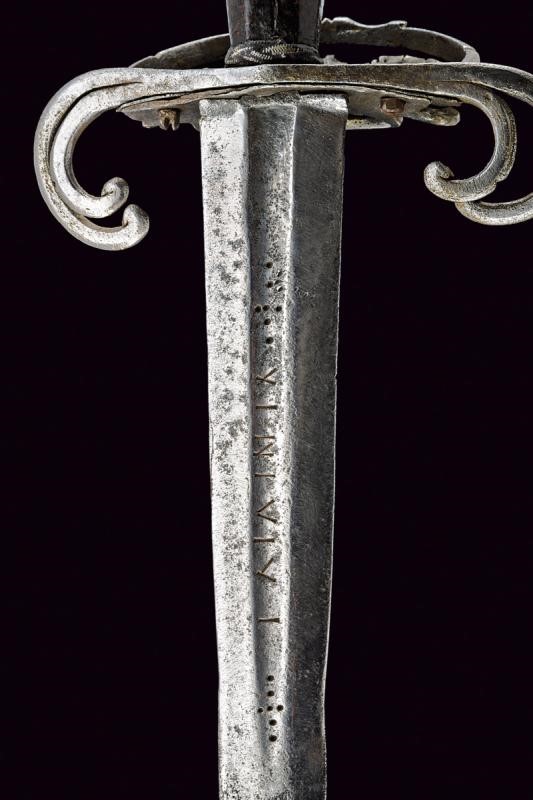 Lama dritta a due fili con vecchia riparazione, in parte con danni da ruggine. La base scanalata e recante iscrizioni. Fornimento in ferro con tre anelli intagliati sul lato anteriore, fra questi la valva, dotata di scanalature a raggi (mancanza al bordo). Tipici doppi rami dell'elso incurvati verso la lama e con intagli geometrici. Pomo di forma ovale, ben proporzionato e faccettato. Impugnatura in legno, del rivestimento rimangono solo le teste di moro.
