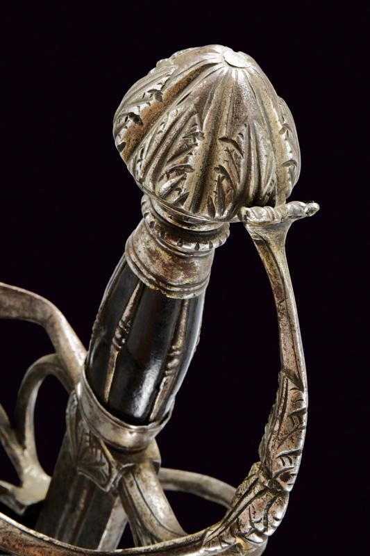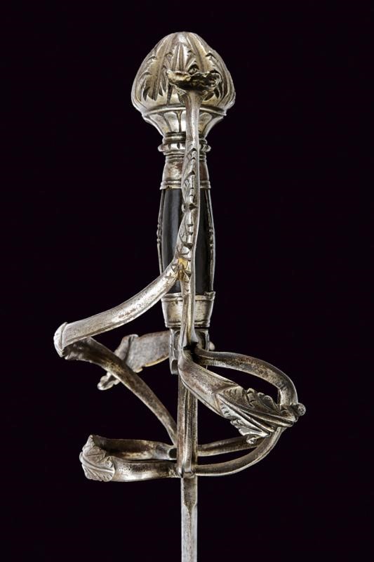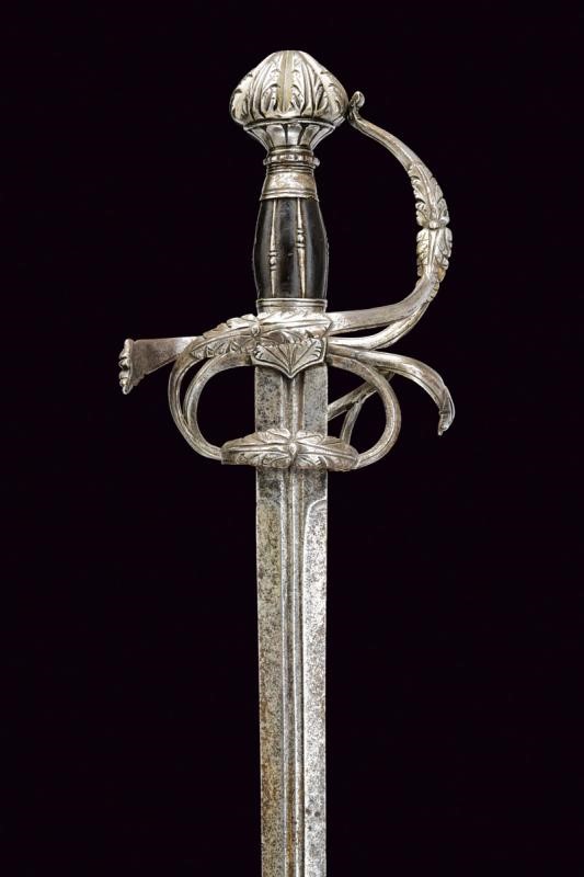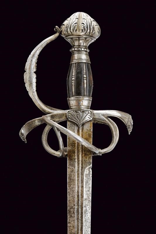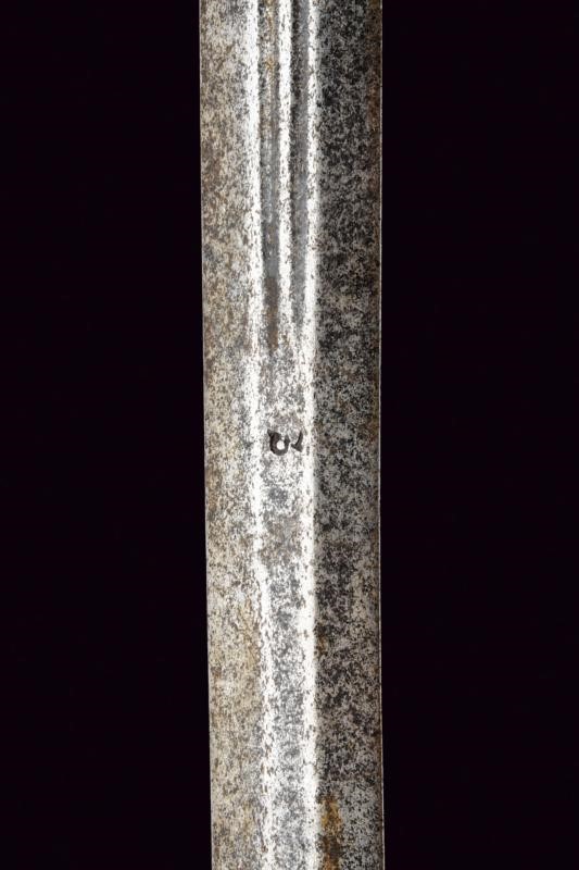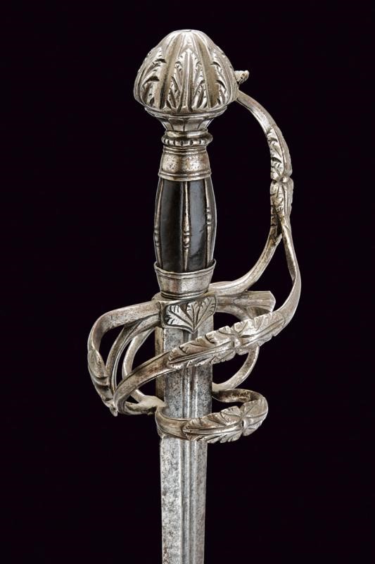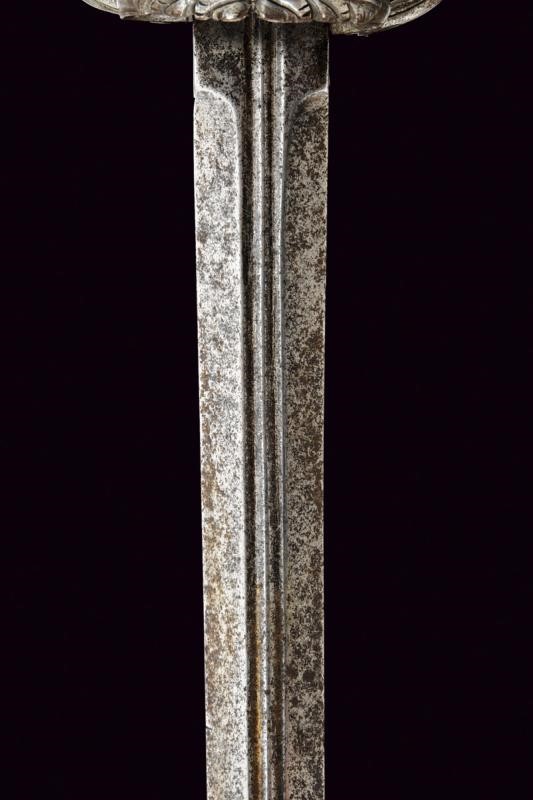 Lama di sezione esagonale a due fili con duplice scanalatura centrale alla base e sul ricasso. Fornimento finemente intagliato a motivi floreali con imponente pomo, breve impugnatura in legno scuro decorata a doghe longitudinali in ferro con intagli al centro.