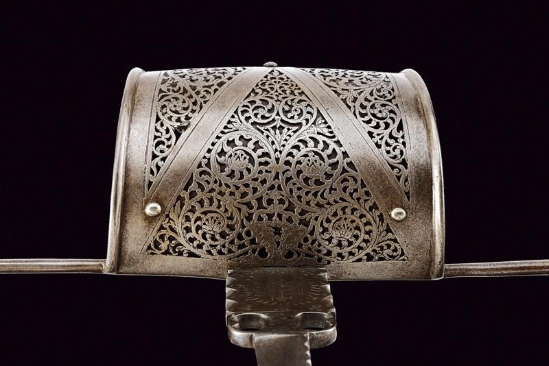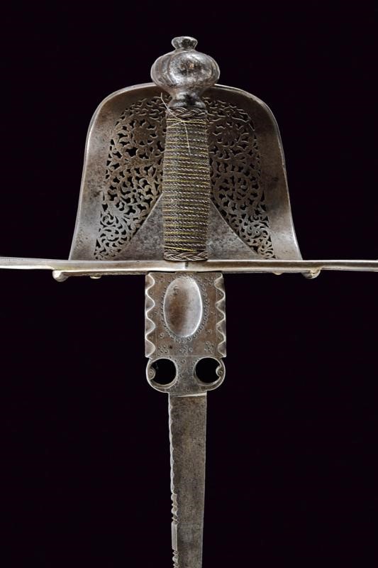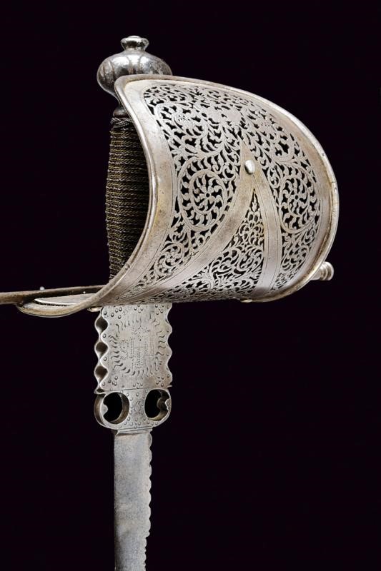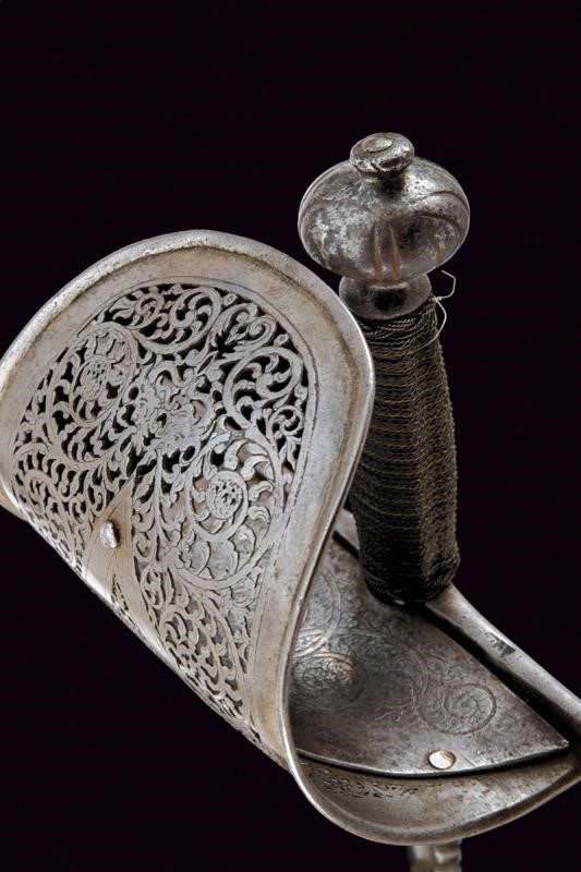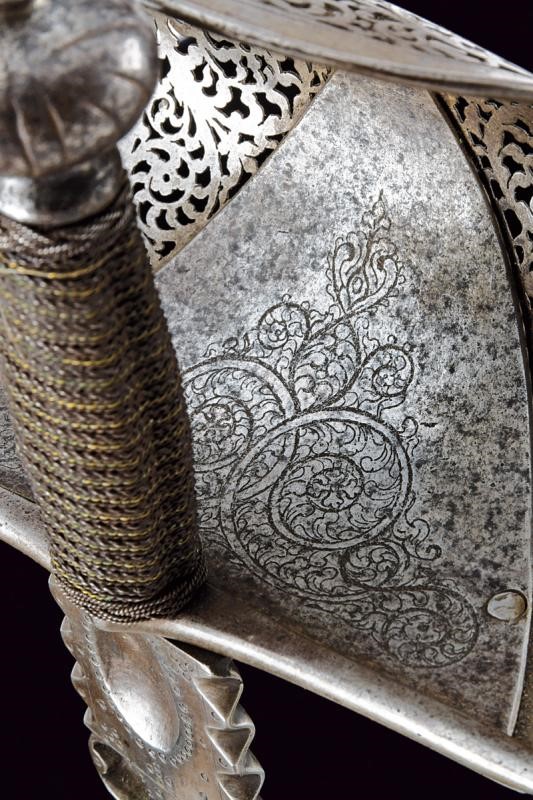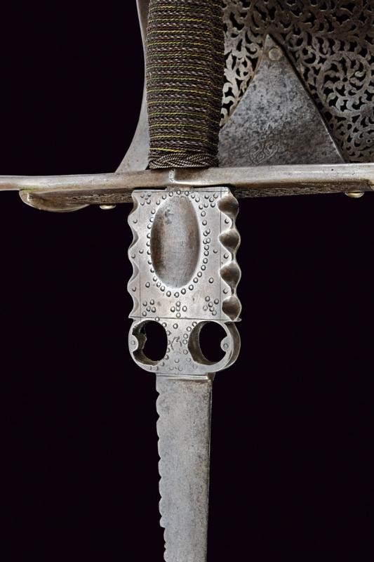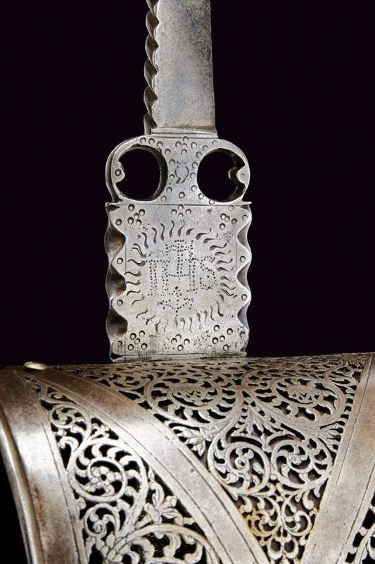 Lama dritta con base triangolare intagliata al dorso, in seguito a losanga. Il largo tallone con duplice traforo e monogramma "IHS" sotto croce in una cornice di fiamme sul lato di terza e, sull'altro lato con sguscio per il pollice, i fianchi ondulati. Fornimento in ferro con lunghi bracci dell'elso, dotati di nodi in testa. Larga vela riccamente traforata a motivi floreali con bordo leggermente rilevato. Contropiastra triangolare incisa a motivi floreali. Pomo a trottola con resti di intagli. Impugnatura in legno rivestita con trecciola e dotata di teste di moro in filo di ferro.