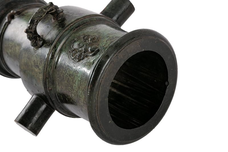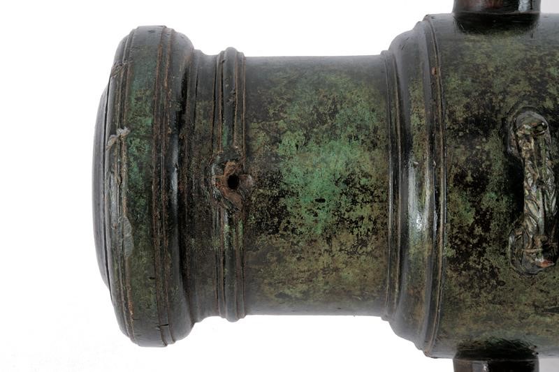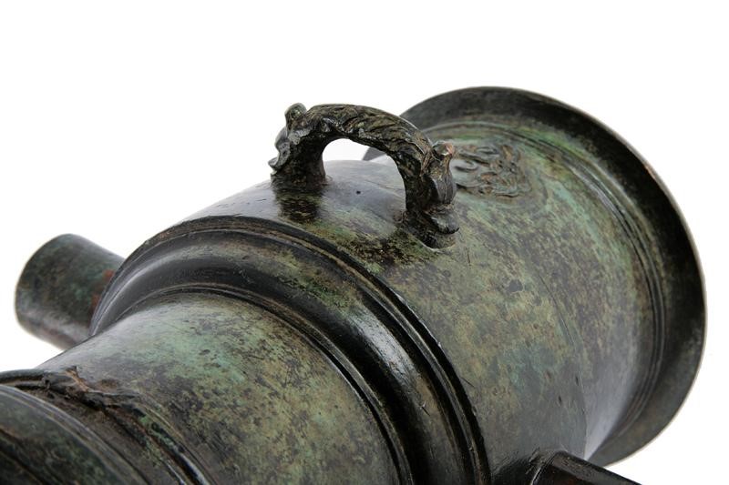 In bronzo, di calibro 81 mm. Di forma cilindrica, con culatta tondeggiante, leggermente rastremata nella prima parte e munita di focone. La parte centrale ingrossata, con robusti orecchioni e maniglia incisa recante le due estremità a testa di drago. Il segmento finale con stemma in rilievo recante una mezzaluna sovrastata da un elmo chiuso. La volata con gioia di bocca. Bellissima patina in color smeraldo.