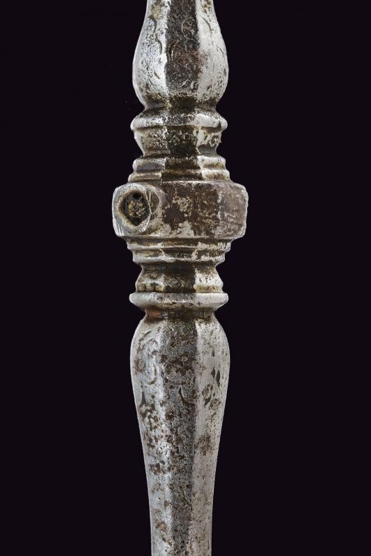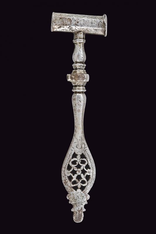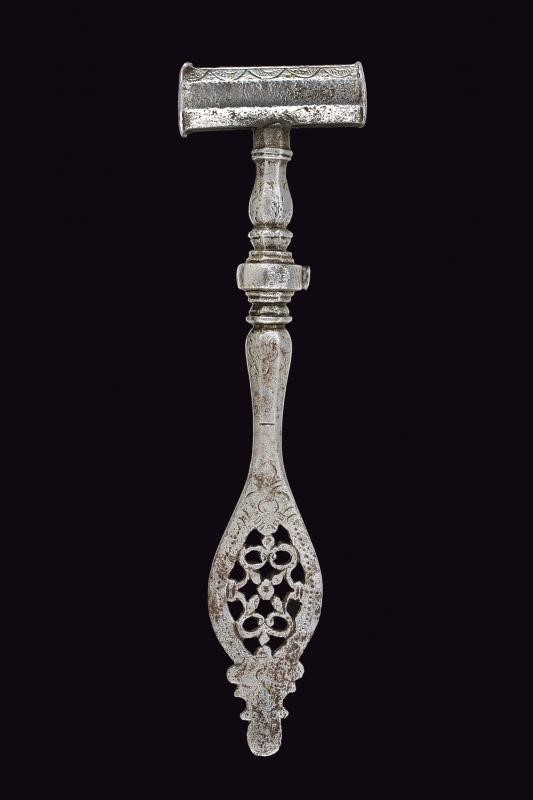 In ferro, la testa di sezione ottagonale posta trasversalmente al corpo, con incisioni geometriche e due aperture; il fusto a balaustro (manca l'anello di sospensione) con base piatta traforata ed incisa. Il puntale con cacciavite.