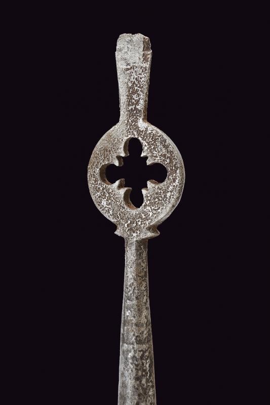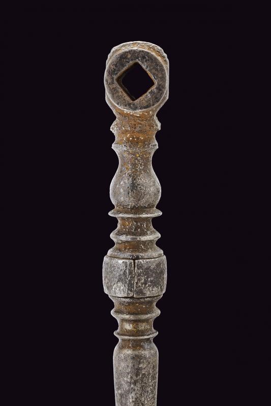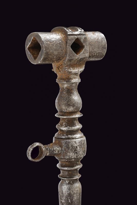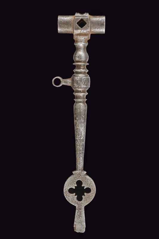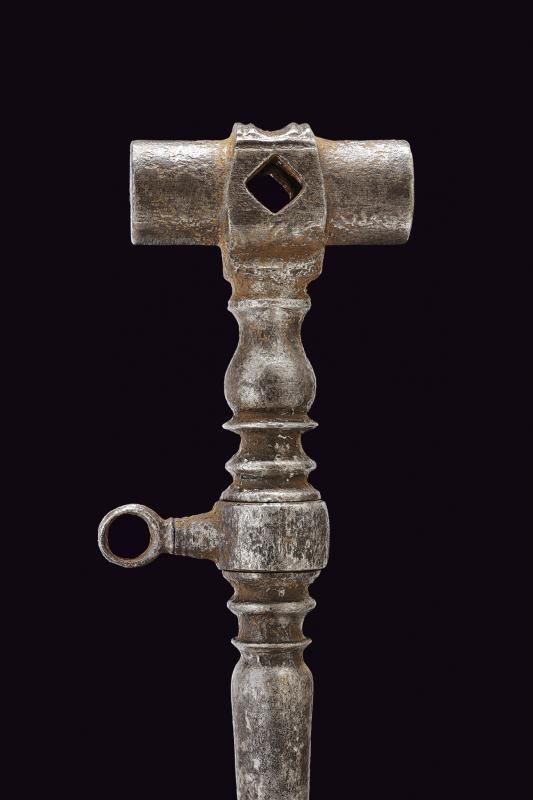 In ferro; testa di sezione circolare con due aperture quadre. Fusto a balaustro, con base traforata e munita di cacciavite. Anello di sospensione mobile al centro.