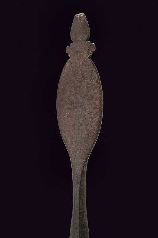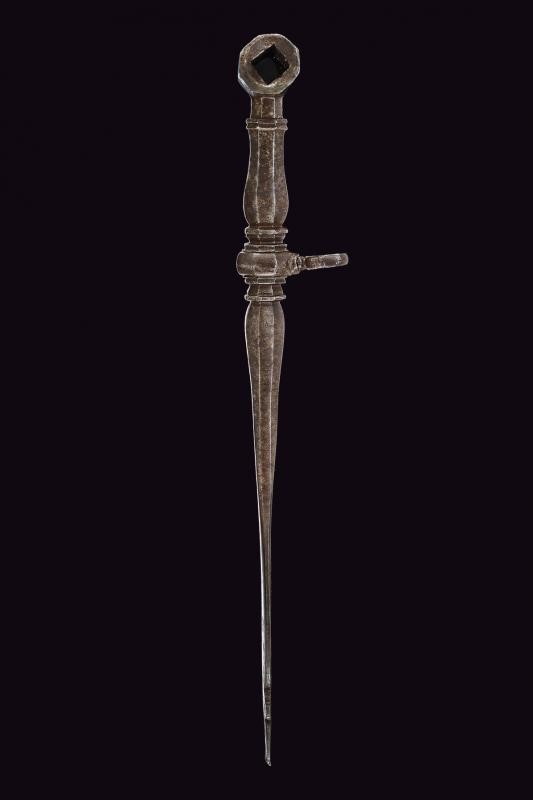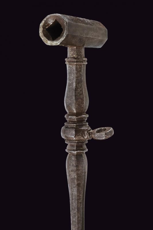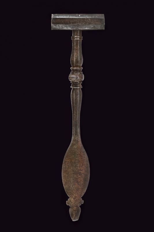 In ferro, con testa di sezione ottagonale trasversale al corpo, due aperture. Fusto anch'esso di sezione ottagonale, con anello di sospensione. La base allargata, piatta e munita di cacciavite.