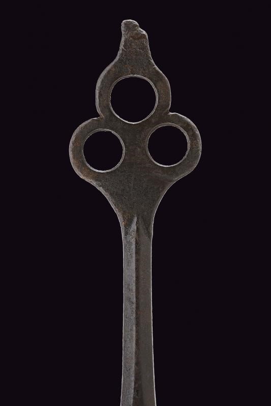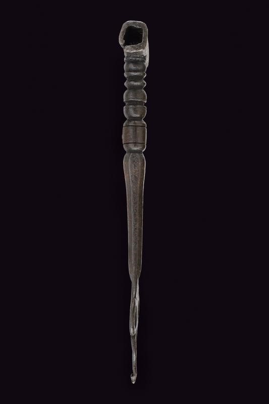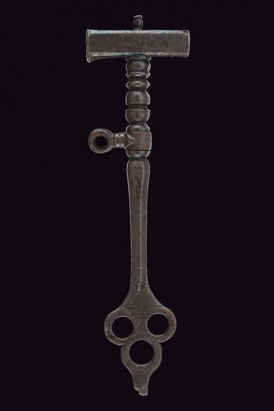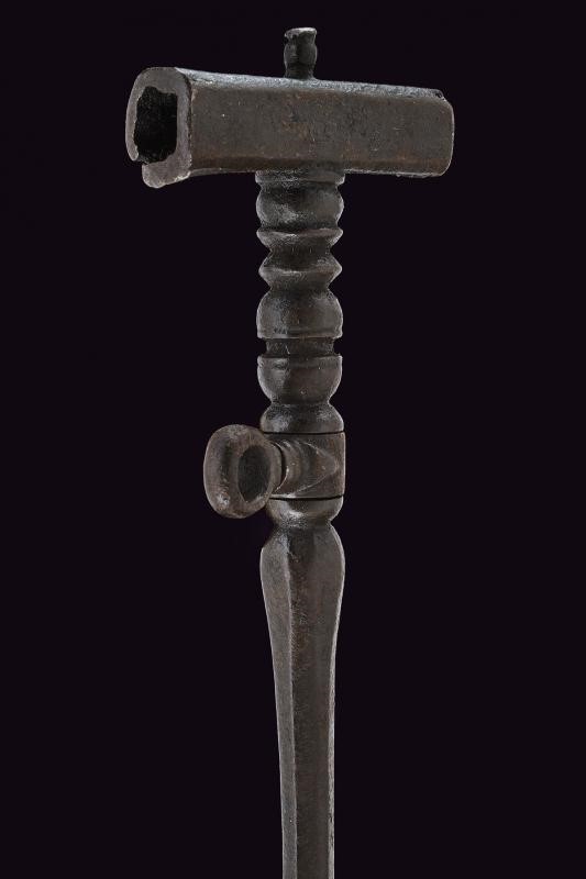 In ferro, testa di sezione quadra con due aperture. Fusto a balaustra, la parte inferiore ottagonale, base allargata e traforata, il cacciavite danneggiato. Anello di sospensione mobile.