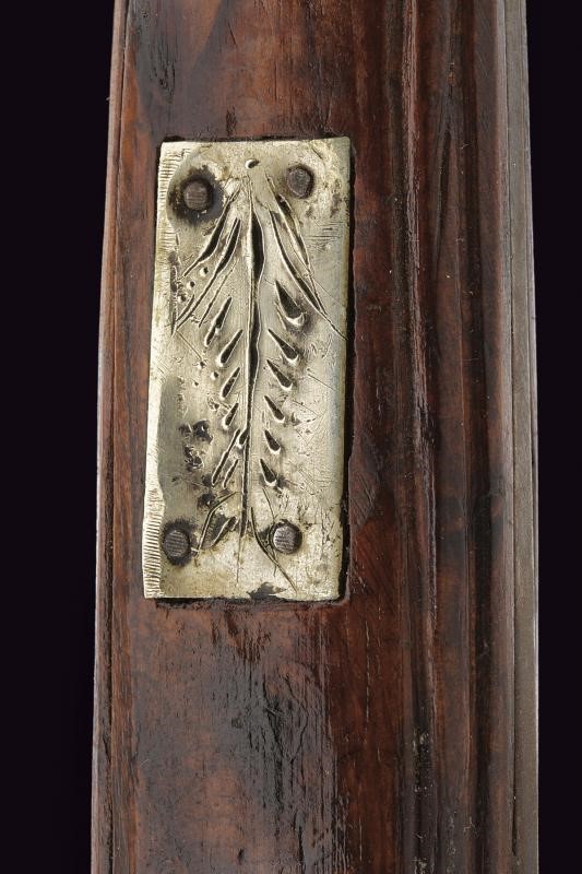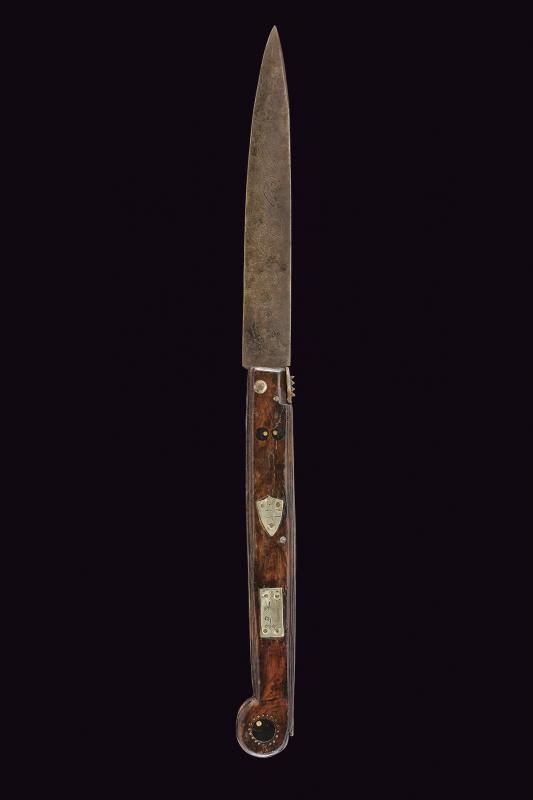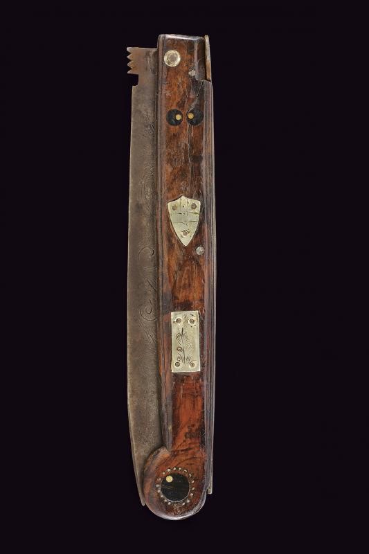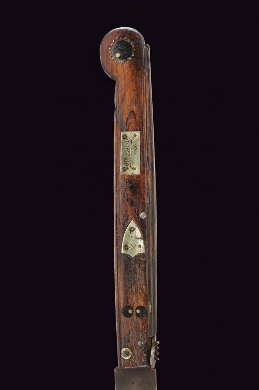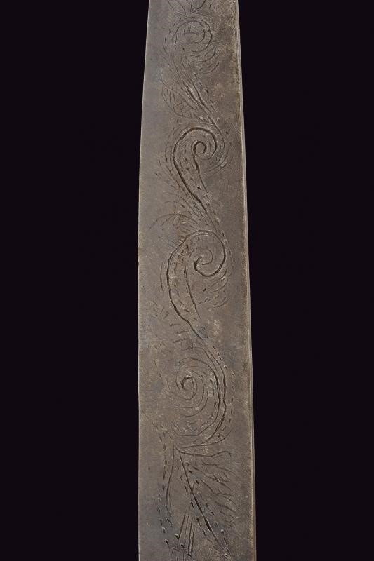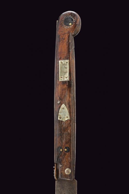 Lama dritta a un filo con semplici incisioni a volute su entrambe le facce. Rara impugnatura in legno decorata ai margini con scanalature longitudinali e con lobatura sul fondo. Le due facce (una con breve crepa) recanti "occhi" in corno bruno con inserto circolare in corno chiaro; sempre su entrambe le facce due fregi in metallo bianco, uno a scudo crociato, uno rettangolare con incisione a racemi. Rara tipologia.