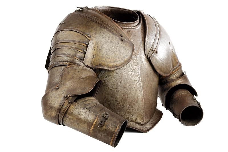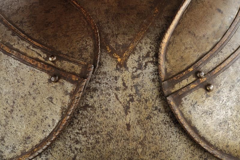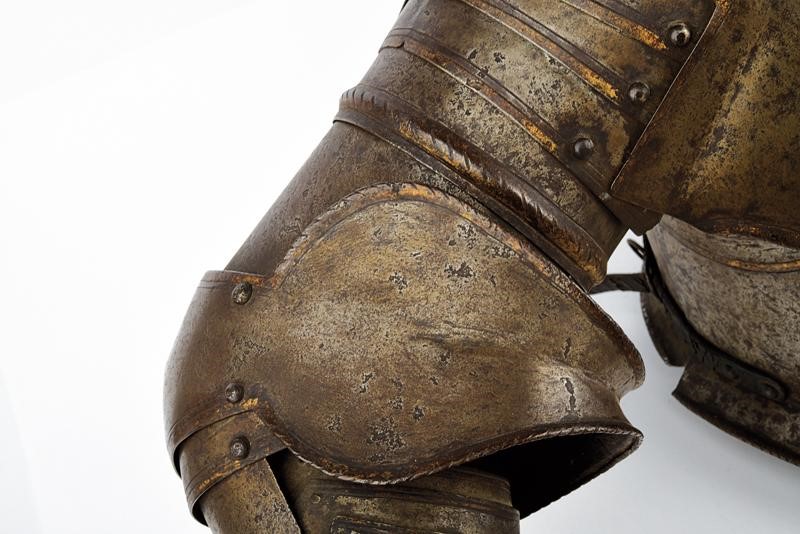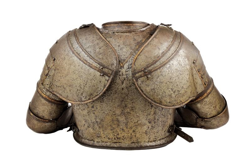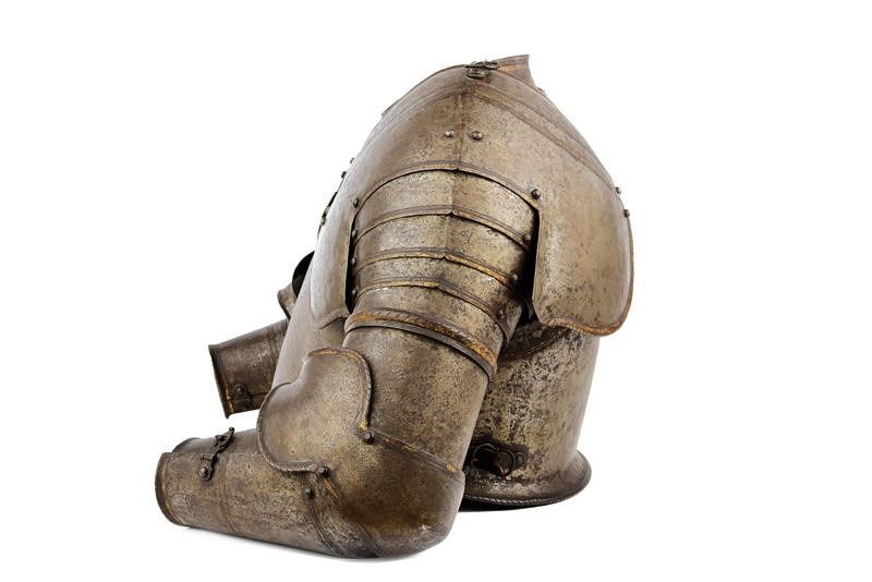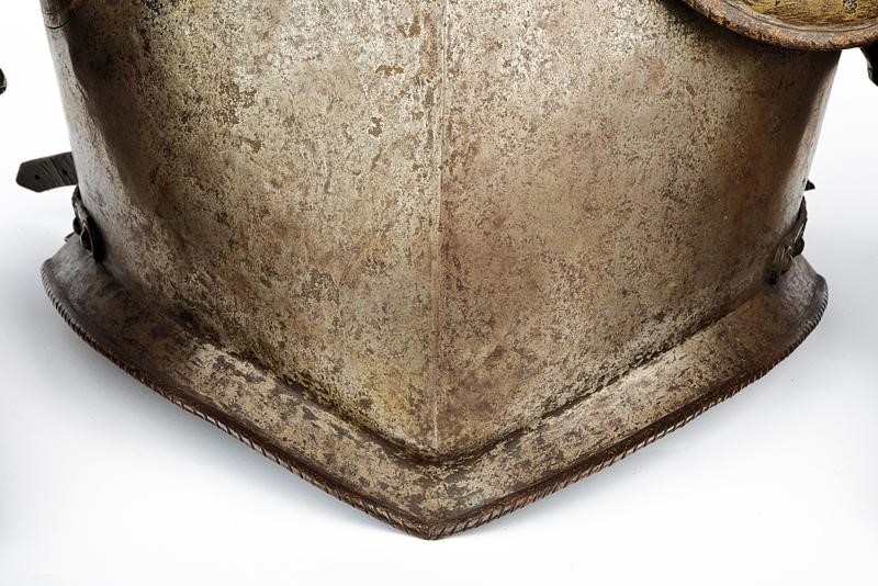 Goletta composta da lama anteriore e posteriore di padiglione, con scollo lavorato a fingere il tortiglione. Petto costolato con scollo e giri ascellari dotati di bordi rilevati e lavorati a fingere il tortiglione; piccola sporgenza obliqua con margine orlato. La schiena lavorata en suite. Grandi spallacci costolati in mezzeria, cubitiere con alette e antibraccio con tre lame interne. Tutti gli elementi con decorazioni omogenee formate da bande dorate e doppie linee. In patina scura.