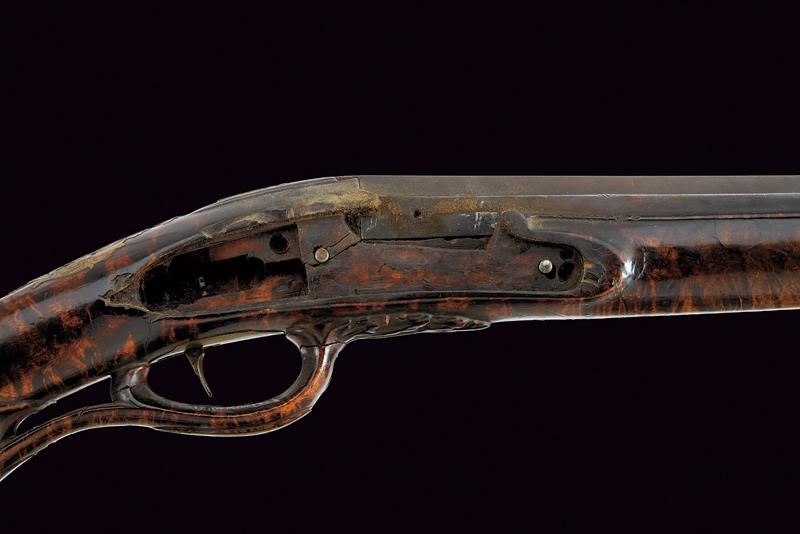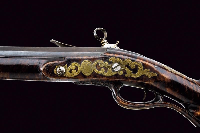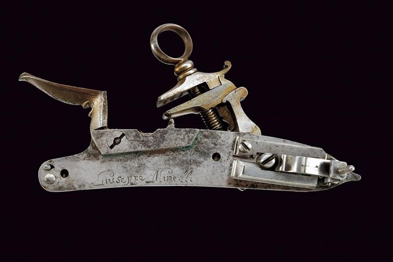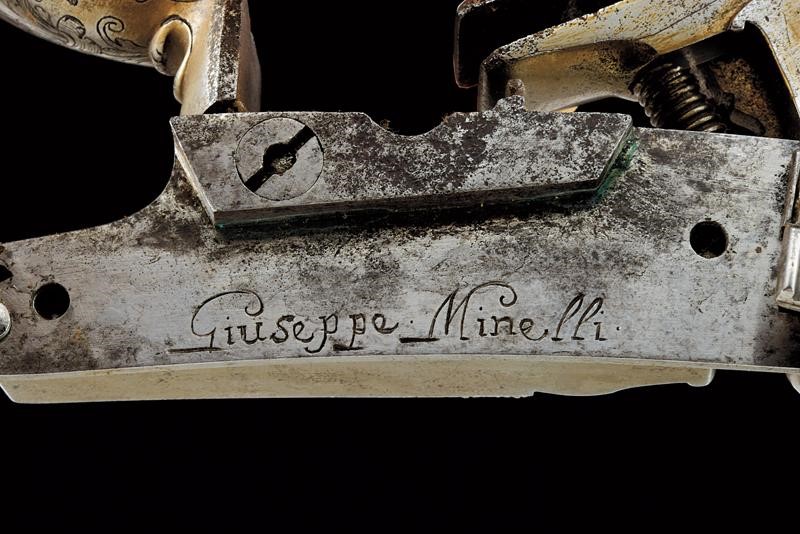 Canna liscia a due ordini, ottagonale e tonda, recante alla base una marca rimessa in ottone con iscrizione "LOIOLA", mirino argentato su base a coda di rondine, alzo fisso in ottone, la finitura brunita (brunitura antica?), in volata cal. 16,5 mm. Elegante batteria a pietra focaia con cartella leggermente tondeggiate incisa alla codetta a motivi floreali così come al collo, sulle ganasce, e allo scodellino. Il retro della piastra con firma "Giuseppe Minelli". Mezza cassa in radica con pala sgusciata, l'astina con crepa verso il bocchino, il ponticello alla cappuccina, qualche piccola crepa e riparazione. Fornimenti in ottone. Calciolo con trofeo d'armi e cornici incise. Al dorso un emblema nobiliare coronato, tenuto da cariatidi e sormontato da mascherone. Il bocchino finemente inciso con mascheroni e grottesche. La contropiastra lavorata anche a traforo. Bacchetta in legno con base per cavastracci in ferro e battipalla in ottone.