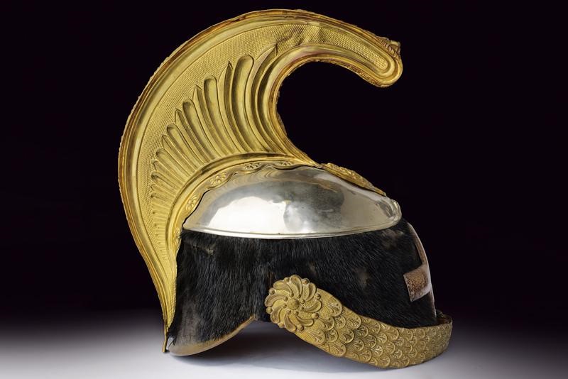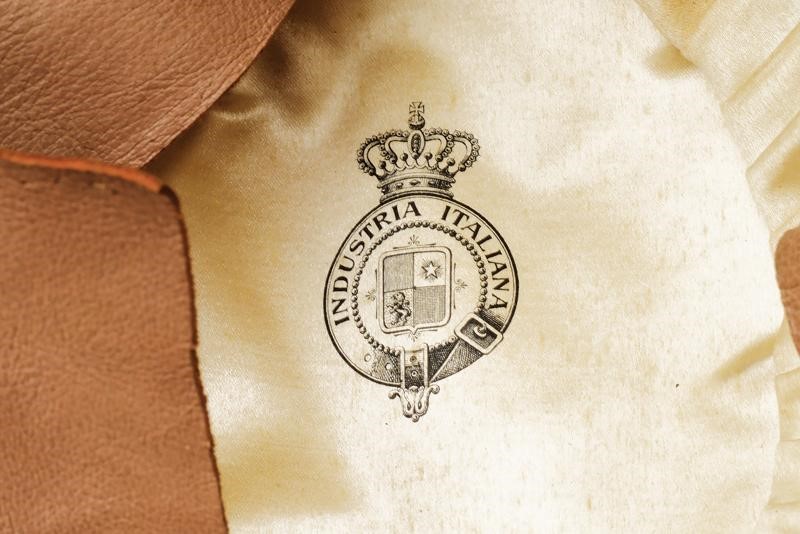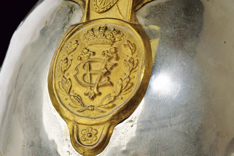 Coppo in alpacca; cimiero in ottone stampato con oliva caricata da monogramma "VE" sotto corona (Re Vittorio Emanuele III). Turbante in pelliccia (mancanze) di phoca vitulina, croce bombata in metallo argentato. Soggoli a squame con coccarda tricolore in cotone. Interno con visiere verdi, alluda in pelle chiara con cuffia in seta marcata "INDUSTRIA ITALIANA".