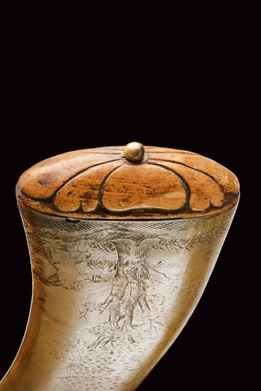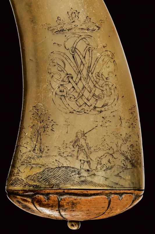 In corno di mucca pressato; lavorata in un solo pezzo con il cannello, a forma di testa di pesce. La base chiusa con placca in legno scolpito a motivi floreali. Su un lato, finemente inciso un monogramma speculare sormontato da corona a cinque punte, soprastante un cacciatore a piedi che regge in spalla il fucile, affiancato dal suo segugio; sul lato opposto il cacciatore mira a due anatre in un lago. Di buona qualità.