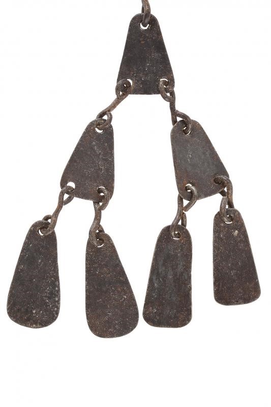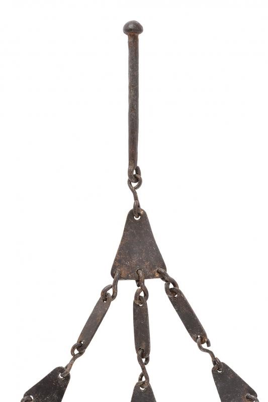 Corta impugnatura cilindrica in ferro con piccolo pomo alla base. All'estremità tre catene che si diramano, costituite da elementi (una incompleto) di forma ovale, triangolare o a pera uniti da segmenti a "S".