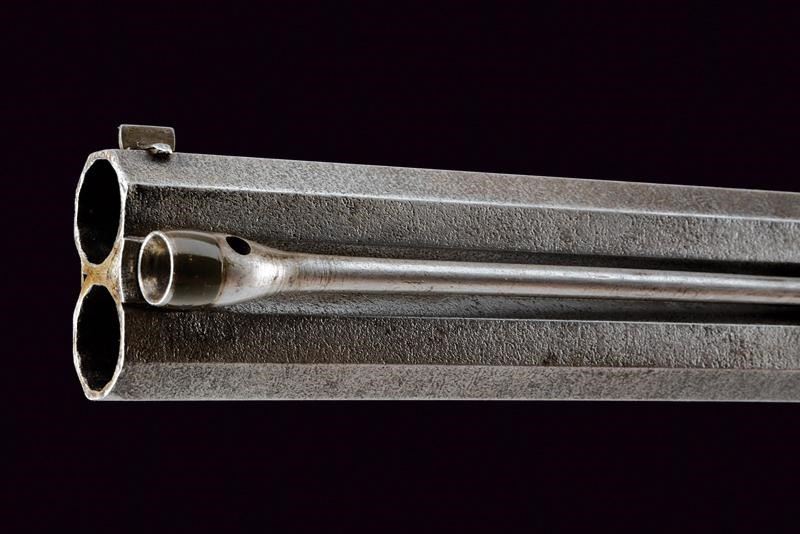 Canne ottagonali, rigate, in damasco ed unite da bindella; alzo e mirino, cal. 17 mm in volata. Batterie a luminello a molla indietro con cartelle piatte decorate con incisioni a motivi floreali, i cani incisi en suite. Calcio in legno (piccoli difetti) con collo zigrinato. Fornimenti in ferro, ponticello inciso en suite alle batterie. Bacchetta laterale in ferro con battipalla in ottone.