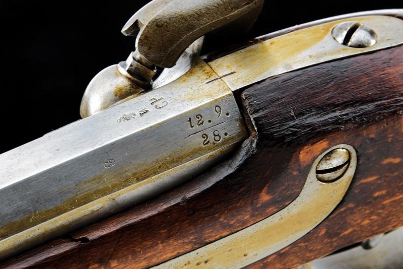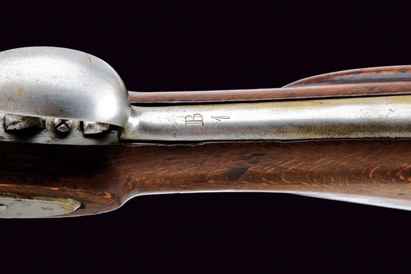 Canna rigata, tonda e con culatta ottagonale con marcature "12.9. /28.", "CP" (probabilmente per Carl Pirko), "W" sormontata da aquila bicipite, e con resti di altri punzoni sul lato destro, non chiaramente leggibili, dotata di mirino e con alzo abbattibile tarato fino a 900 passi, cal. 13,9 mm. Quattro righe all'interno. Batteria a sistema Lorenz con cartella datata "858" e codetta con punzone ad aquila bicipite. Meccanica ben funzionante. Cassa intera in legno. Fornimenti in ferro. Qualche intaccatura al calciolo. Ponticello punzonato "B". Grilletto e stecher funzionanti. Bacchetta in ferro con battipalla in ottone.