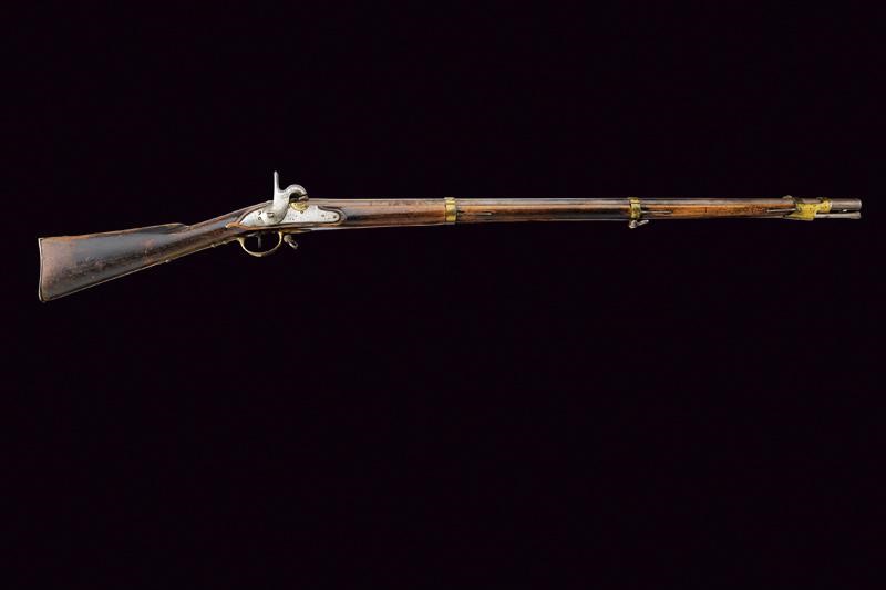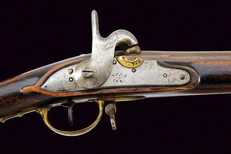 Lunga canna liscia, tonda, con culatta ottagonale, questa con punzone ad aquila imperiale, data "1844" e altre marcature e numerazioni; mirino, cal. 17 mm. Batteria convertita a luminello con cartella marcata "TULA" (in cirillico) e data "1848(?)" (l'ultimo numero poco leggibile); scodellino in ottone tagliato per la conversione e focone tappato da disco. Cassa intera in legno (segni d'uso e del tempo). Fornimenti in ottone, ponticello marcato "1844 141" e lettere in cirillico, contropiastra numerata "1843 110", calciolo con codolo munito di grosso punzone ad aquila bicipite coronata e con lettera "H" al centro. Bacchetta in ferro. Raro.