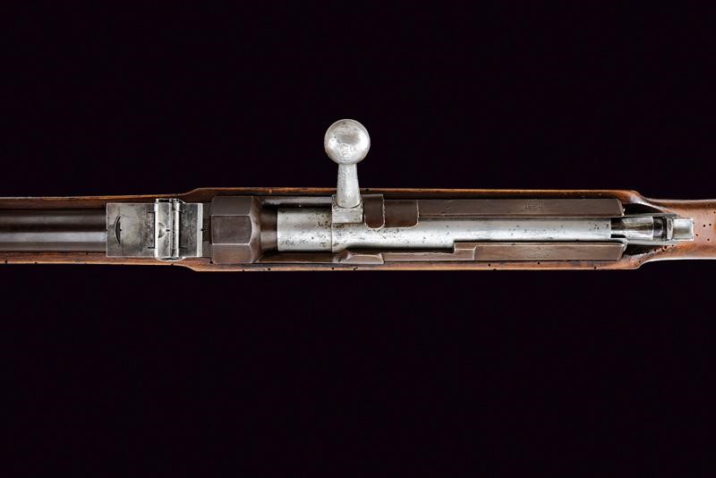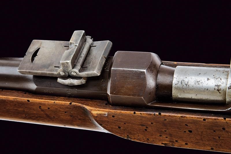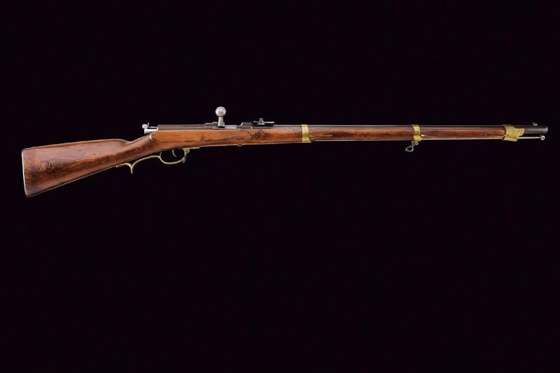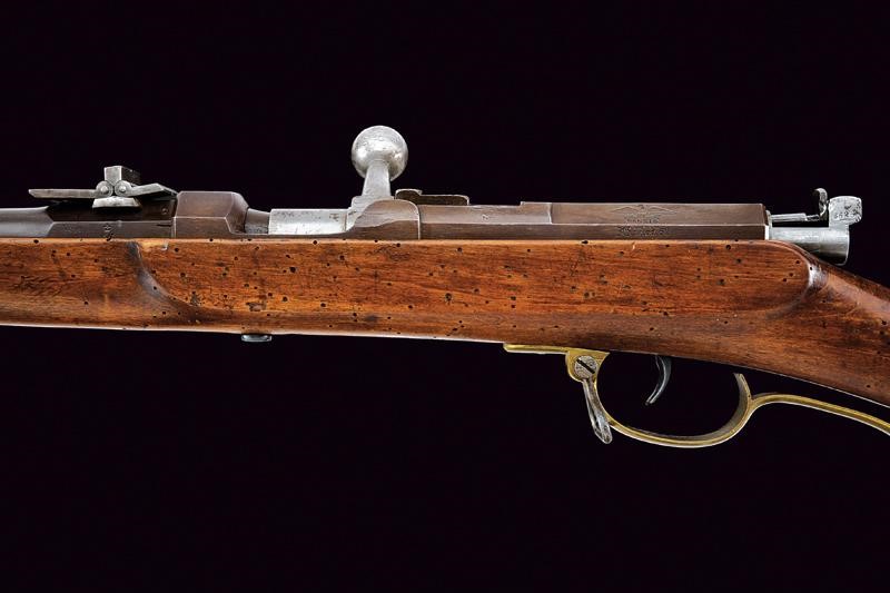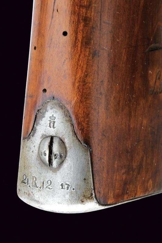 Canna tonda rigata con culatta ottagonale recante vari punzoni fra cui "FW" sotto corona, numero di matricola "56xx" e marcatura "Stahl"; alzo a fogliette abbattibili e mirino, cal. 15 mm. Otturatore girevole-scorrevole con sistema Dreyse marcato "DANZIG", modello, data, con aquila. Cassa intera in legno con timbri e diversi fori da tarlo. Fornimenti in ottone. Bacchetta in ferro.
