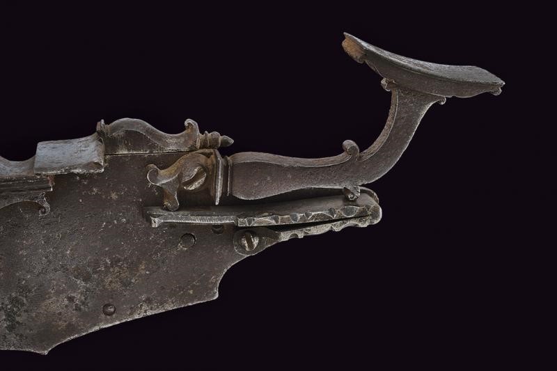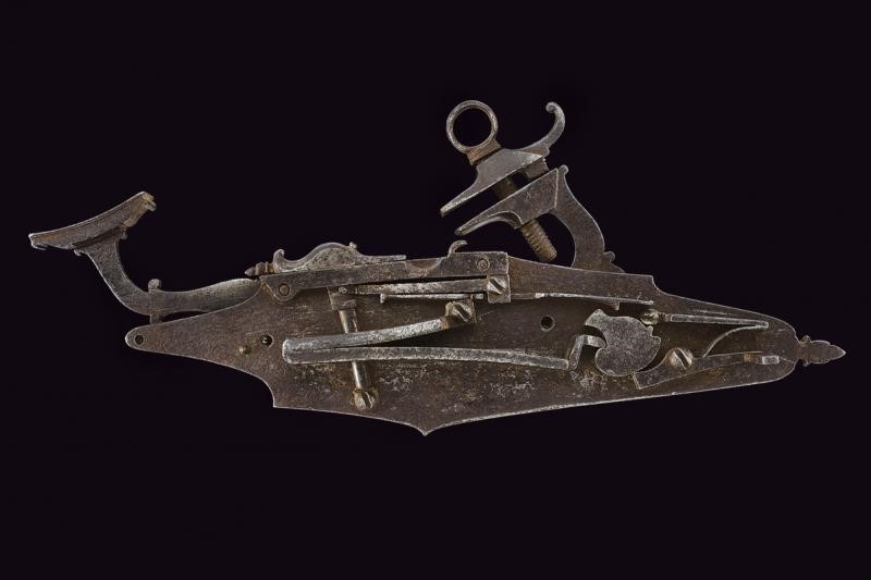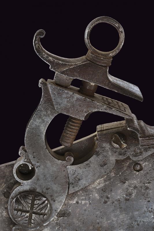 Grande cartella, ancora nella foggia delle piastre a ruota. Il cane con testa del vitone a croce e intagliata a foglie. L'arresto del cane esterno fissato sotto allo scodellino, questo a decoro modanato. Piccoli elementi a ricci sia al collo del cane che alla martellina. Sul retro meccanica completa. Robusta meccanica probabilmente d'impiego militare. In bella patina antica.