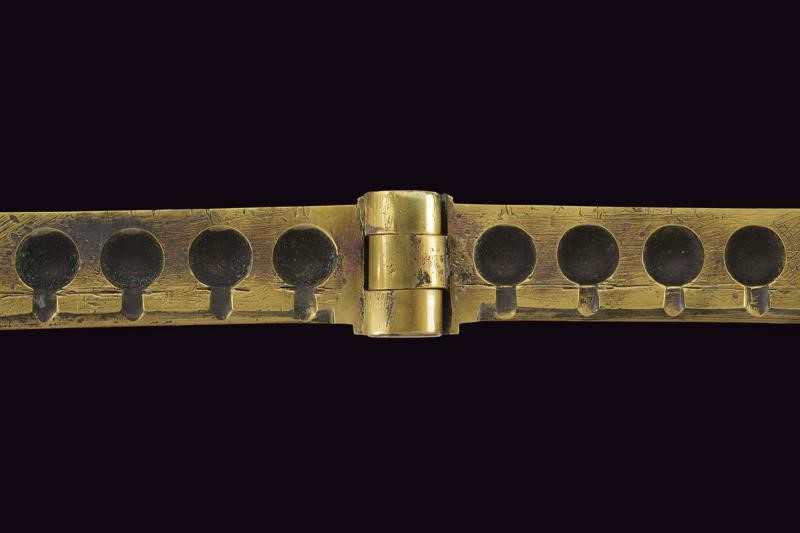 Pinza in ottone a cinque cavità sferiche di cal. 16.4 mm. Ghiere in ottone e manopole in legno (crepe e difetti).