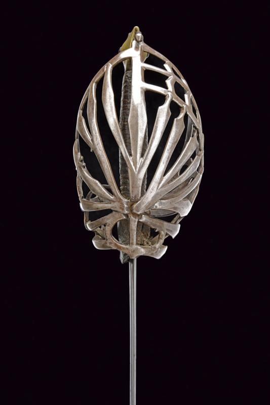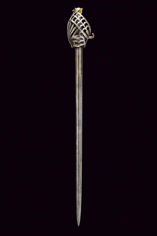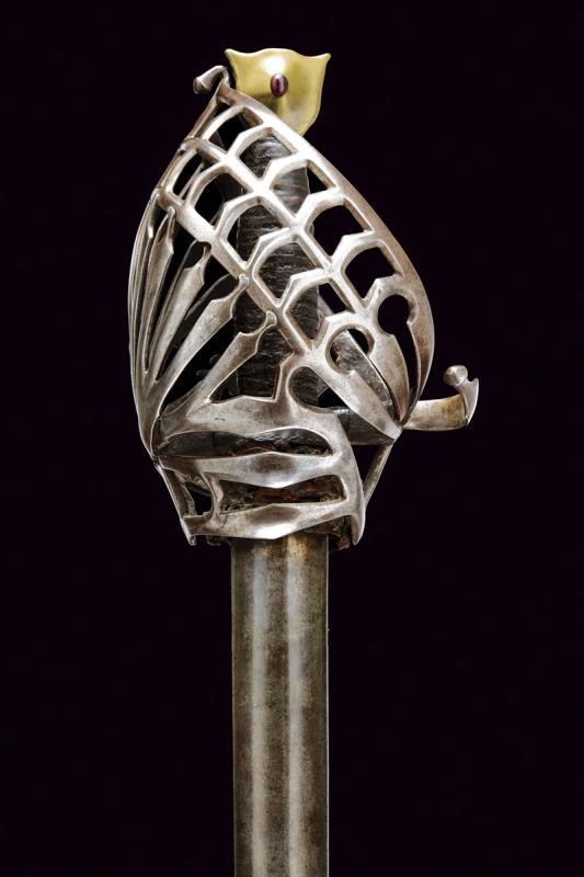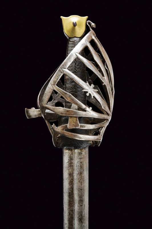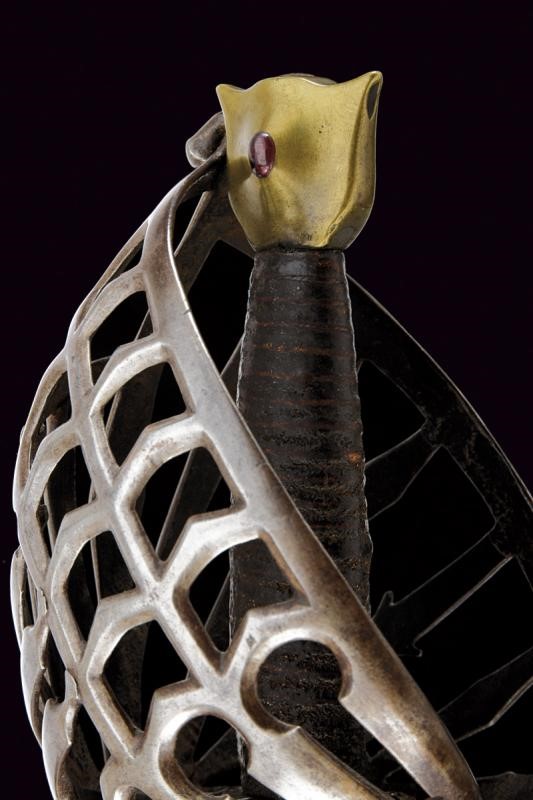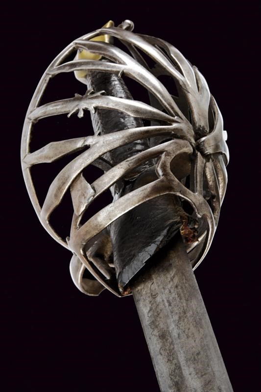 Lama dritta a un filo e controfilo con duplice scanalatura alla base che si triplica in seguito. La base recante sul lato di quarta resti di inscrizione o incisioni, il ricasso ricoperto di cuoio. Bel fornimento a gabbia in ferro, tre doghe sul lato posteriore con intagli, quella centrale a granchio. Braccio dell'elso incurvato. Anello da pollice. Pomo in bronzo a testa di gatto arricchito con pietra rossa al centro su entrambi i lati. Impugnatura in legno rivestita di cuoio.