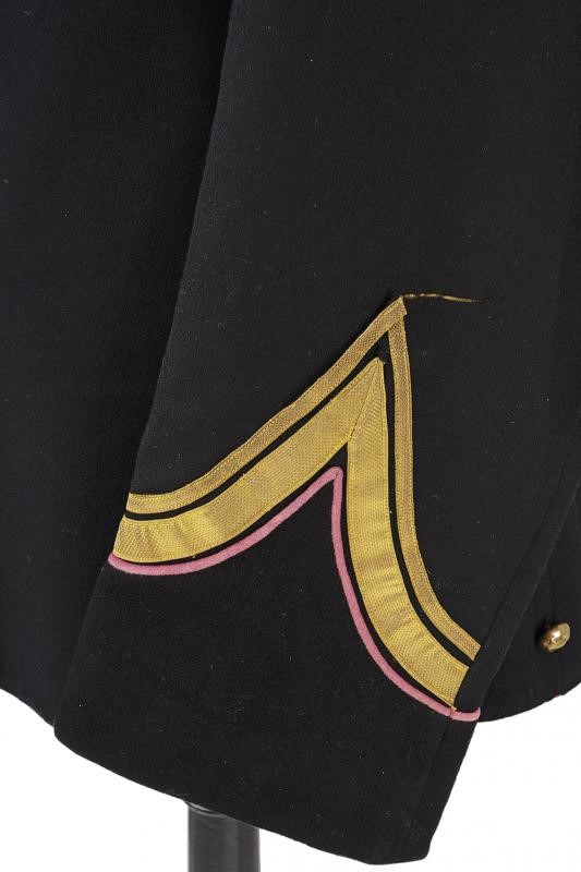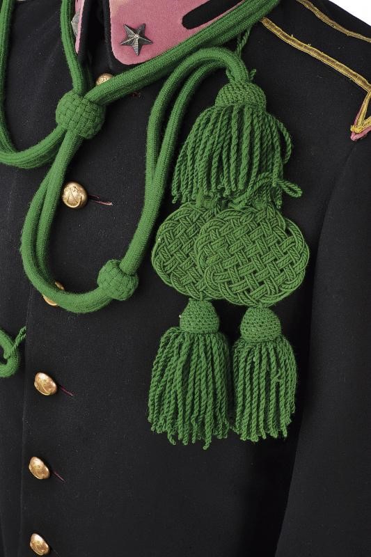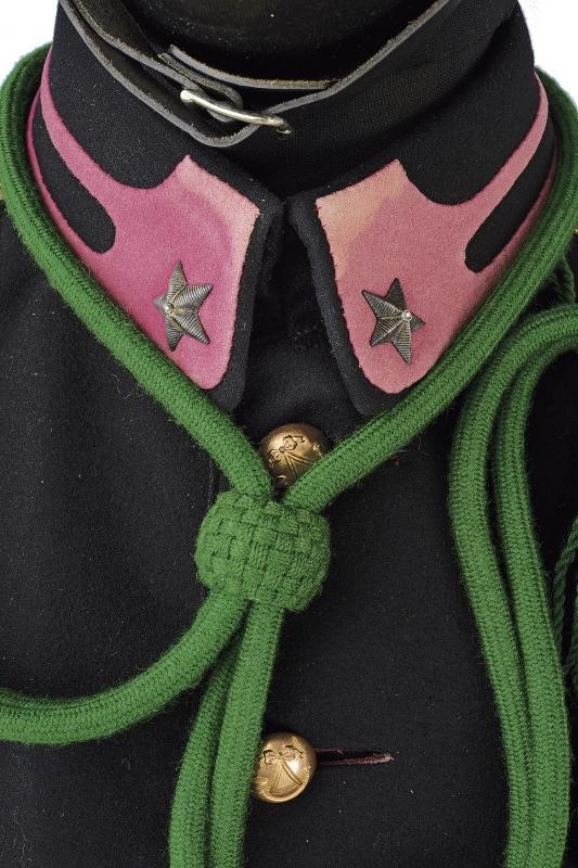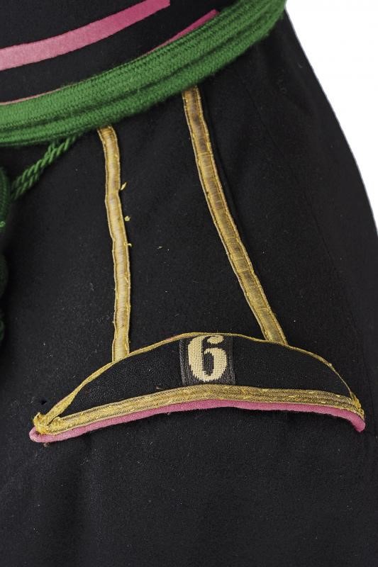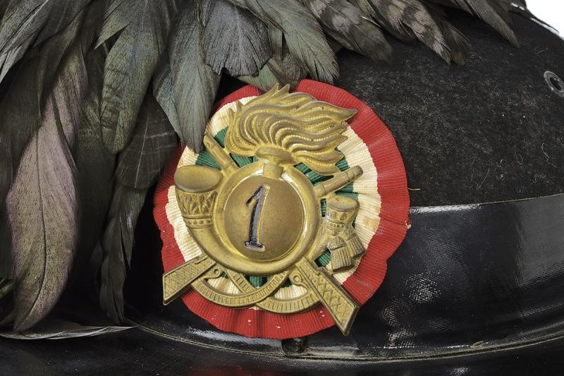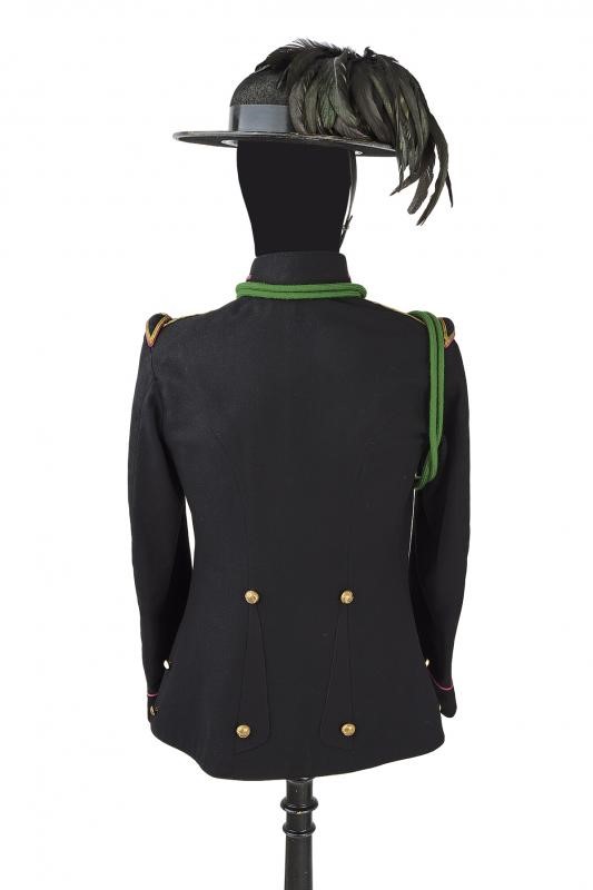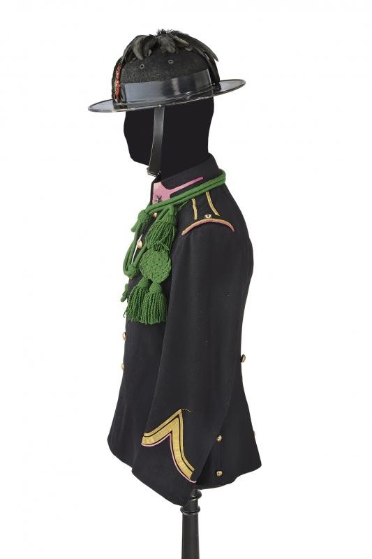 Moretto con coppo in feltro nero avente ampia tesa cerata nella parte superiore; fregio frontale metallico con numero "1" su coccarda in tessuto; all'interno alluda in cuoio nero e passanti per la cinghia in cuoio; completo del piumetto. Giubba in tessuto nero, ben conservata (danno alla manica sinistra nella zona del gallone) Completa di spalline a lunotto cucite con profilature colorate e bordi in canutiglia, al centro numero "6". Bavero con mostrine in color cremisi slavato caricate da stella (il retro marcato "BERETTA") in metallo. Tutti i bottoni presenti con fregio a trombetta, il retro di ognuno marcato "UNIONE MILITARE A. M & C.ie". Ai polsi gallone. L'interno parzialmente rivestito in tessuto nero. Completa del tipico cordone a fiocco in lana verde dei Bersaglieri.