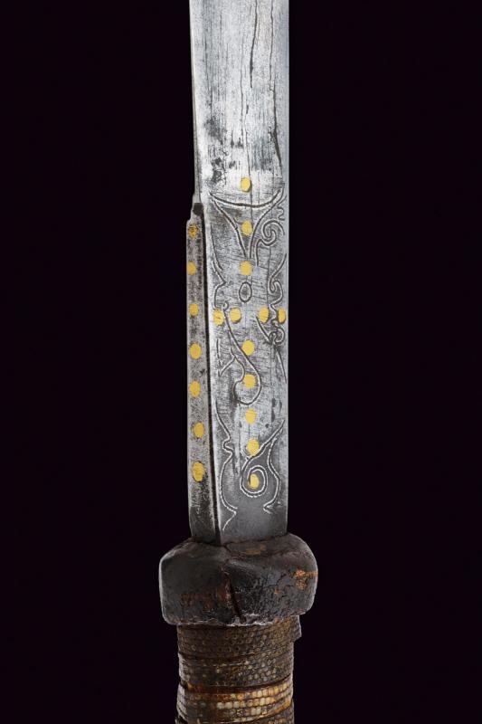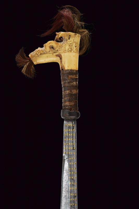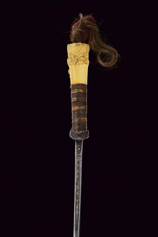 Lama dritta a un filo, piatta su una faccia, con dorso dritto ma angolato in punta, con dischi in ottone ed incisioni a motivi geometrici su tutta la superficie del lato di terza. Fornimento in corno di cervo con trecciola in pelle di pesce e grande pomo intagliato e traforato. Ciuffi di crine tricolore. Privo di fodero.