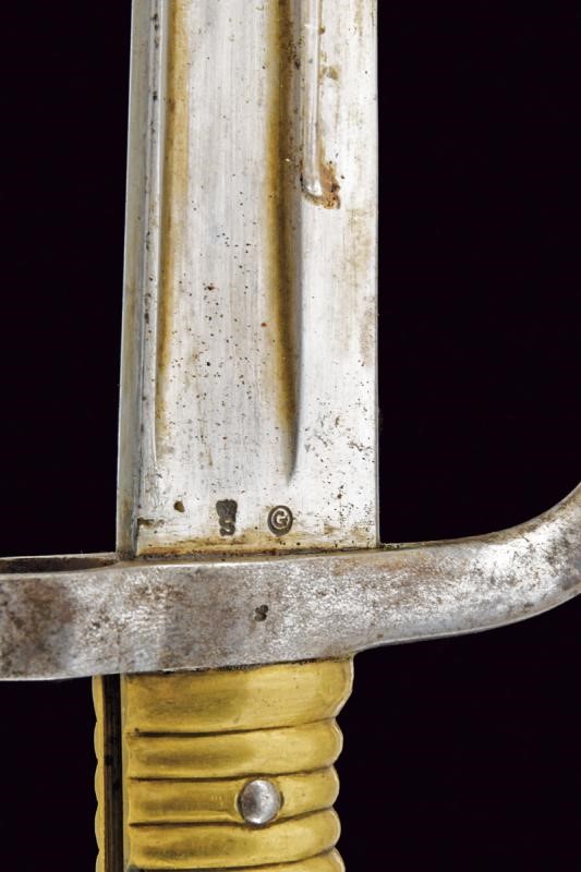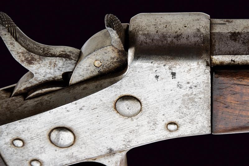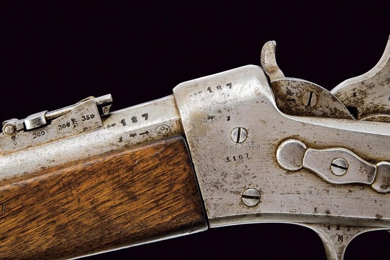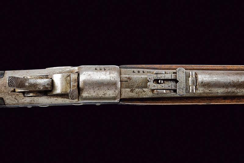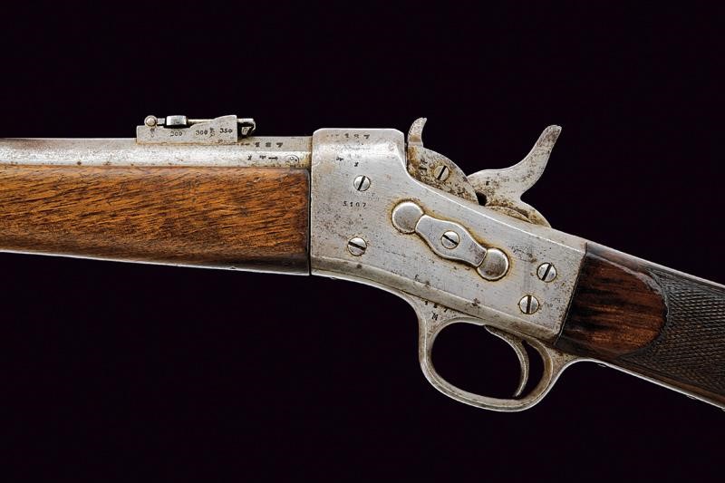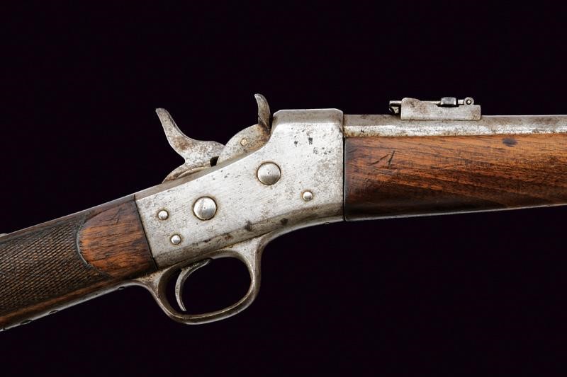 Canna rigata, tonda, con base ottagonale marcata con punzone del banco di prova di Liegi, numero di matricola "1xx" e altri punzoni; alzo variabile, mirino e guida d'innesto per la baionetta, cal. 12.7 mm. Castello con matricola coeva, marcato "BREVET REMINGTON 5107" (poco visibile). Calcio ed astina (anch'essa marcata "1xx") in legno (segni d'uso e del tempo). Fornimenti e bacchetta in ferro. Insieme ad una baionetta a yatagan (lunghezza: 71 cm), crociera con anello e ricciolo, impugnatura in ottone e molla in ferro; fodero in ferro.