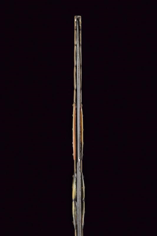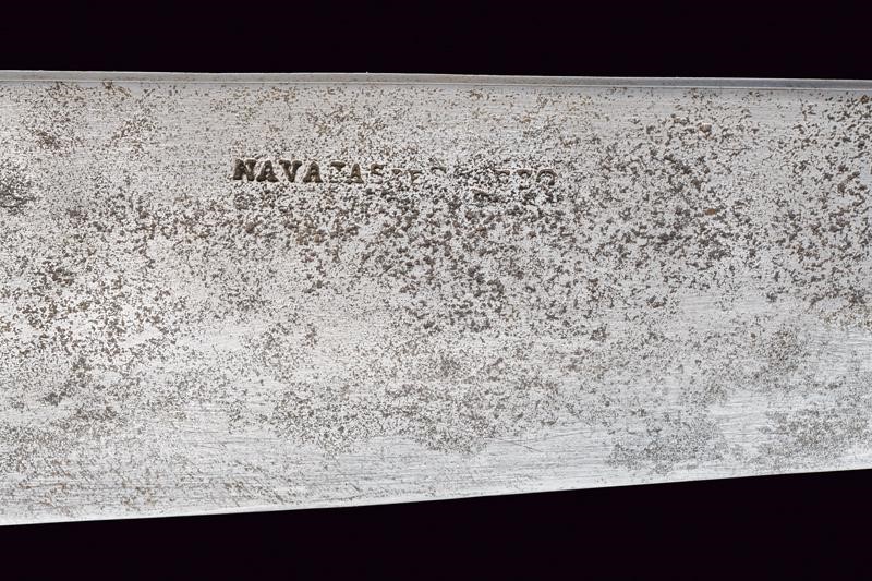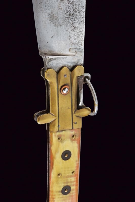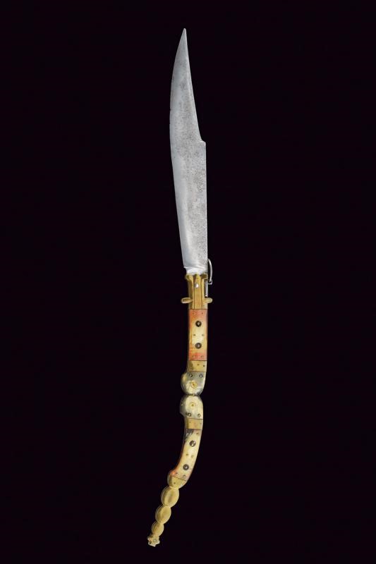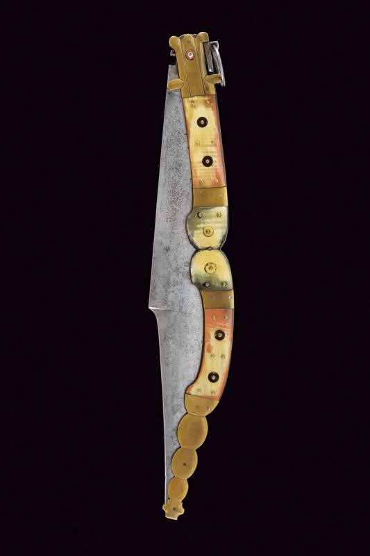 Lunga lama a un filo (piccole mancanze) dotata di scalino dorsale, resti di marcatura su un lato "NAVAJA ...."; tallone. Impugnatura in ferro con guancette in corno colorate, elementi di raccordo in ottone. Sul dorso molla in ferro con grosso anello.
