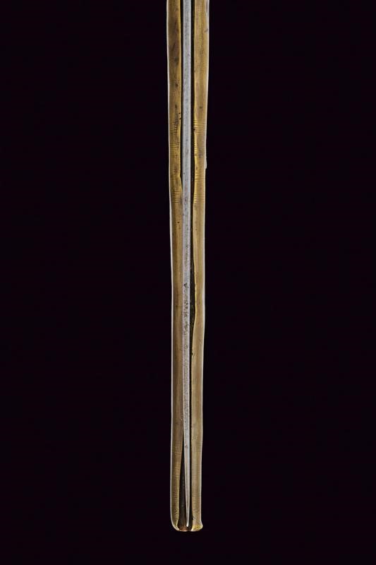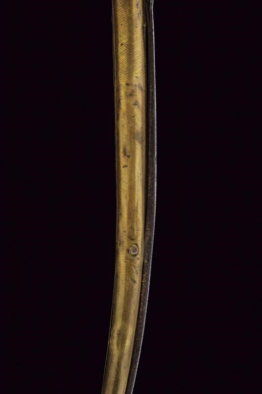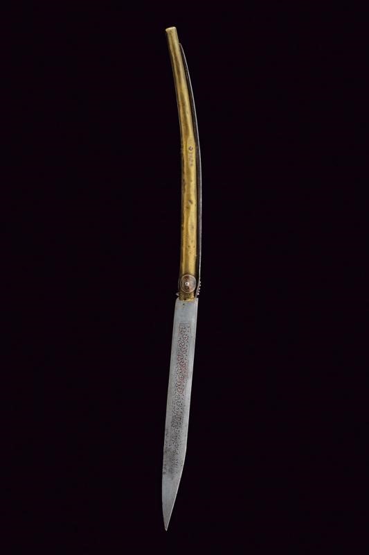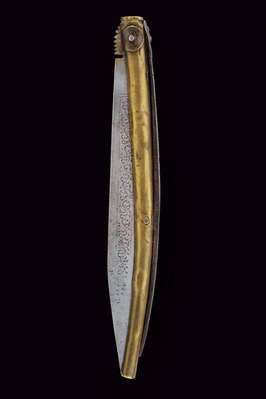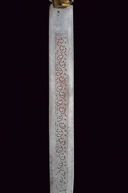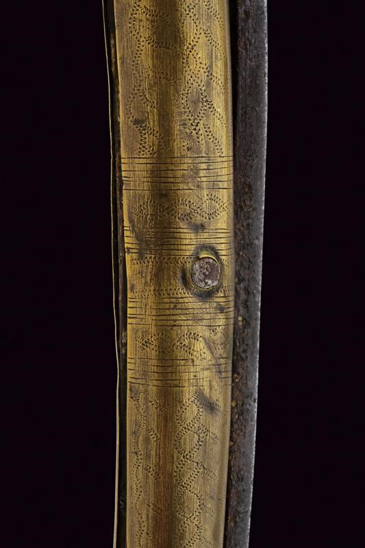 Lunga lama a un filo incisa a motivi geometrici e dipinta parzialmente di rosso. Impugnatura in legno rivestita con lamina d'ottone inciso. Il perno che connette la lama e l'impugnatura fissato con due monete. Il dorso con lunga molla.